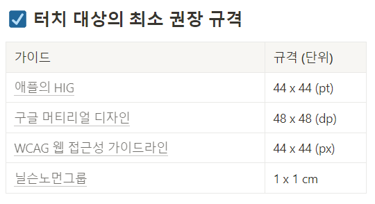 터치해야하는 대상은 사용자가 정확하게 선택할 수 있을 만큼의 크기