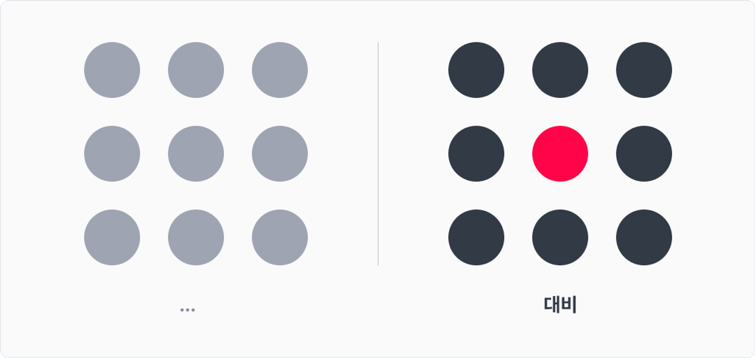 중요하다고 생각하는 요소는 채도가 높고 색상 대비를 크게, 덜 중요한 것은 채도도 낙고 색상 대비를 크지 않게