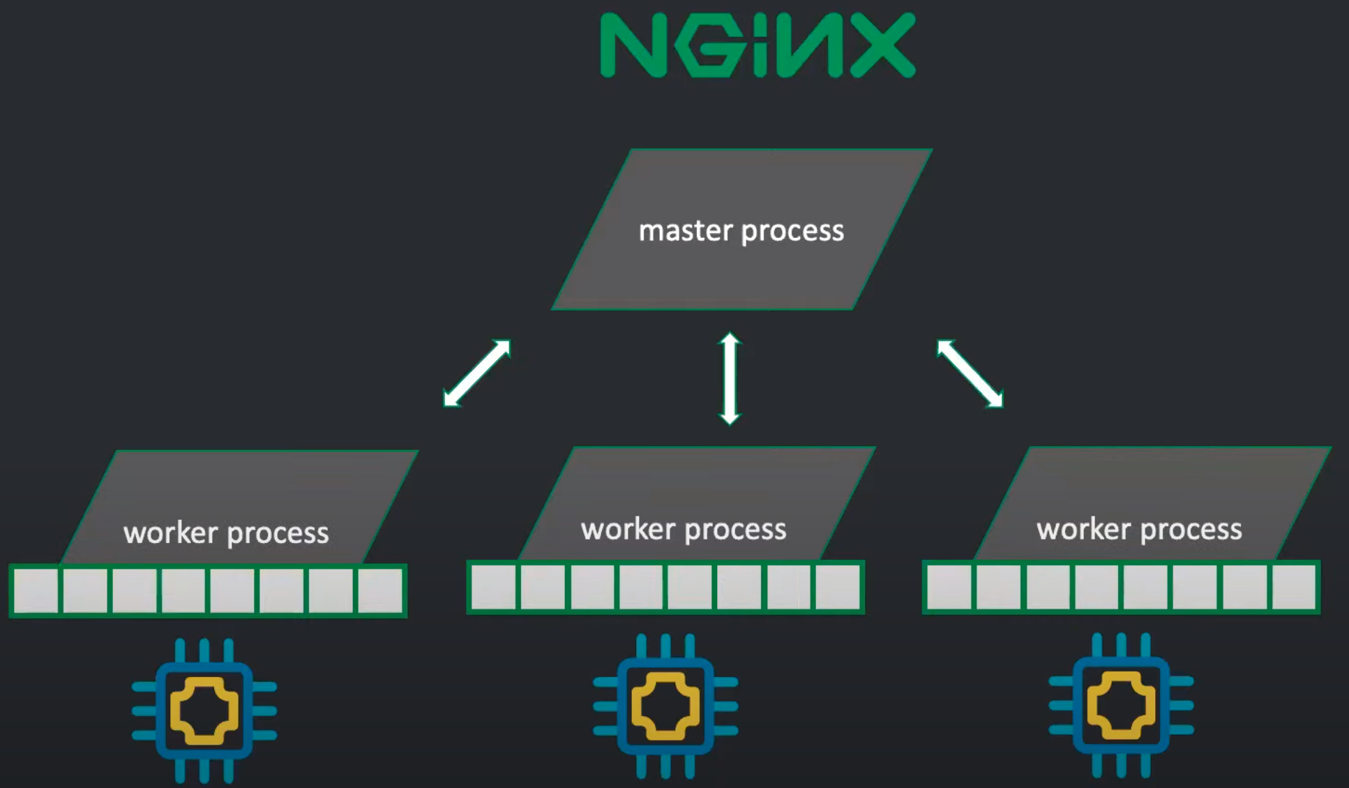 Ngin는 하나의 Master Process와 N개(보통은 cpu의 코어 개수)의 고정된 Worker Process로 구성되어 있는 Event 기반 구조를 가지고 있다.