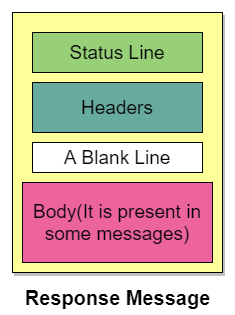 클라이언트로부터 요청 메시지를 수신한 서버는 해당 요구를 처리한 후에 그 결과를 응답 메시지 형식으로 회신한다. 응답 메시지의 구조는 요청 메시지와 거의 동일하지만, 요청문 대신에 처리 결과를 의미하는 상태문(Status Line)이라는 용어를 사용한다.