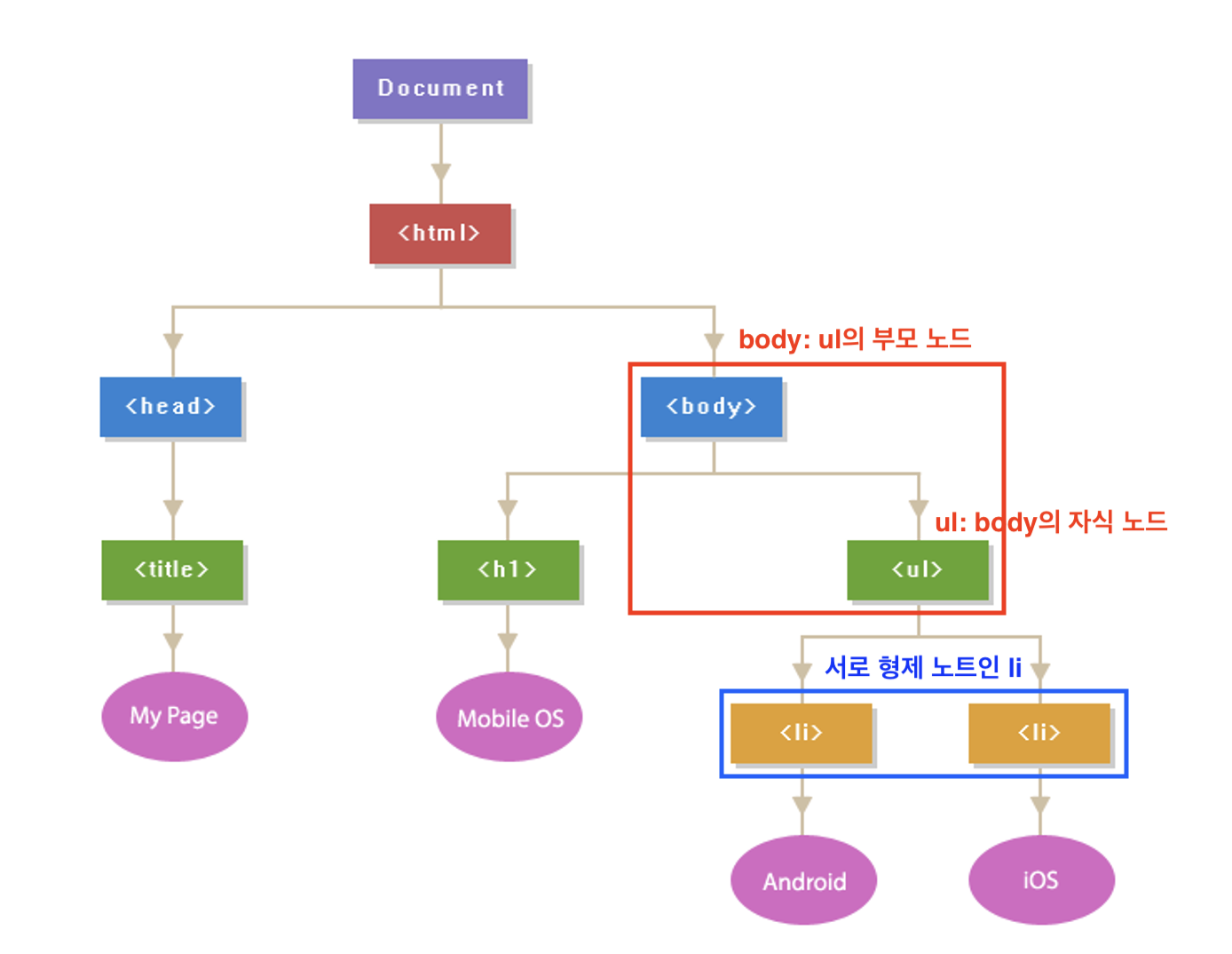 DOM은 모두 노드로 이루어져 있기 때문에 부모노드 - 자식노드관계로 이루어져 있다.