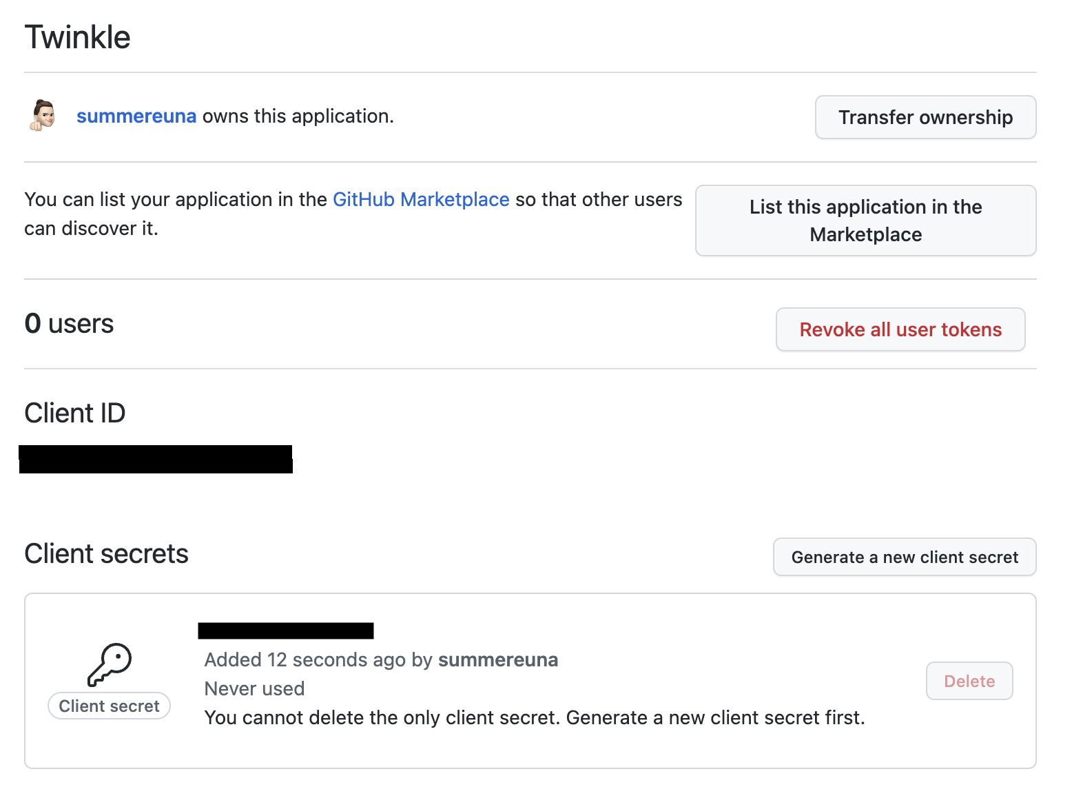 Register application์ ํด๋ฆญํ๋ฉด Client ID์ Client secret์ด ๋ฌ๋ค. ์ด๋ฅผ ๋ณต์ฌํ์.