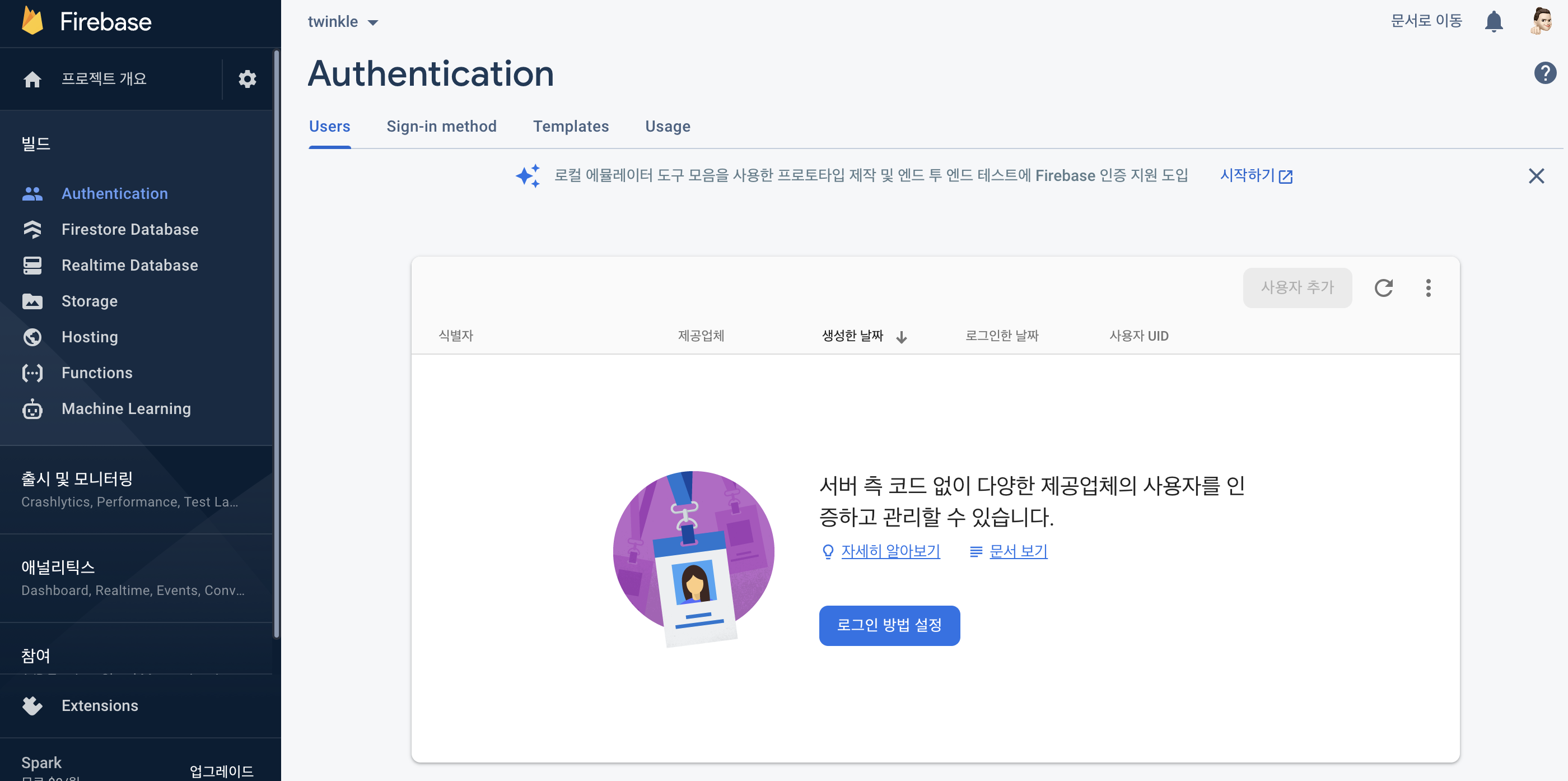 Firebase ์ฝ์์์ Authentification์ผ๋ก ๊ฐ๋ฉด ์์ง ์ ์ ๊ฐ ์๋ฌด๋ ์๋ ๊ฒ์ ํ์ธํ ์ ์๋ค.