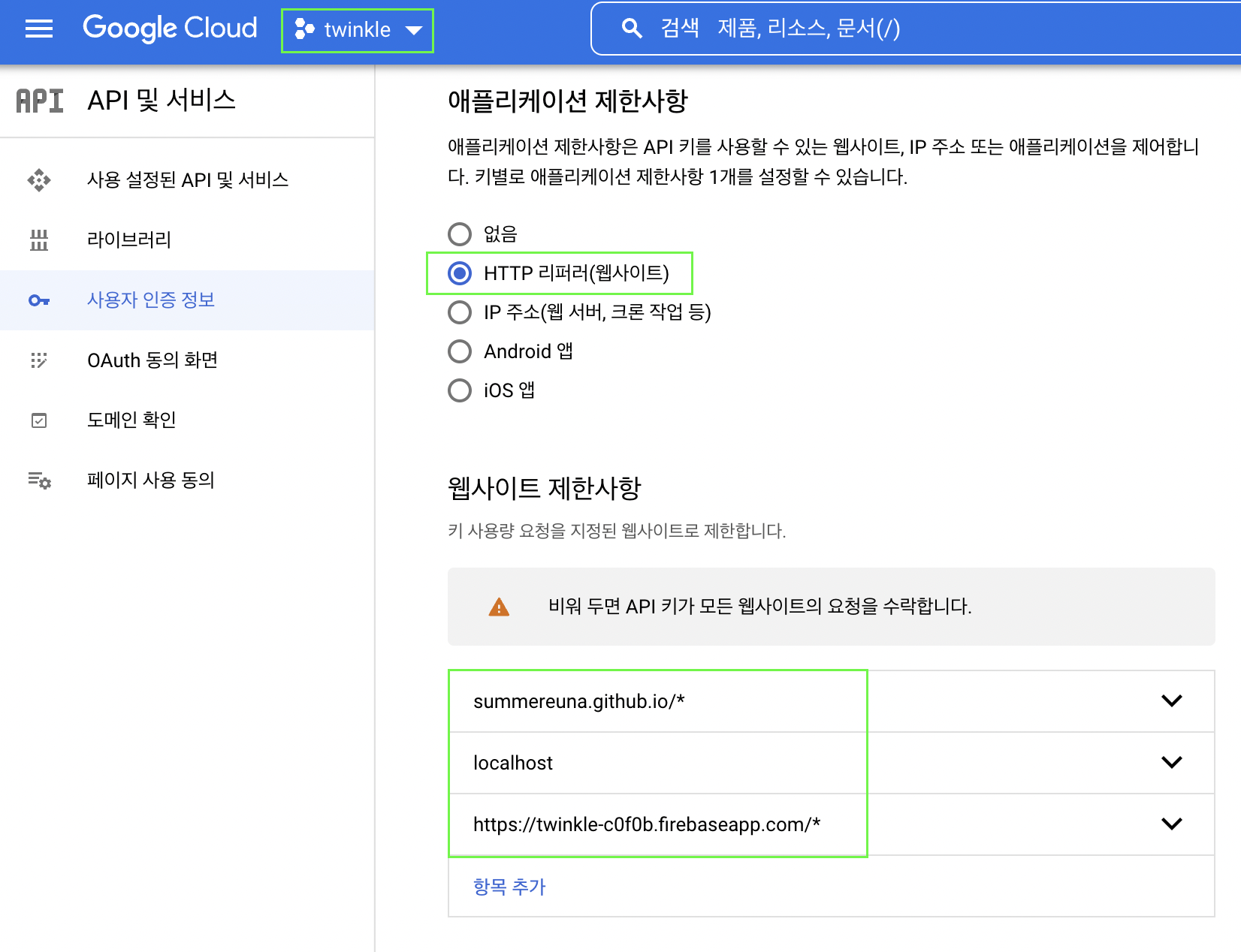 ์ด๋ ๊ฒ ํ๋ฉด ์ฌ๊ธฐ์ ์ถ๊ฐํ URL๋ง API Key๋ฅผ ์ฌ์ฉํ ์ ์๋ค. ์ฆ, ์ด ๋๋ฉ์ธ์์๋ง ์ธ์ฆ ๋์์ ํ ์ ์๋ค.