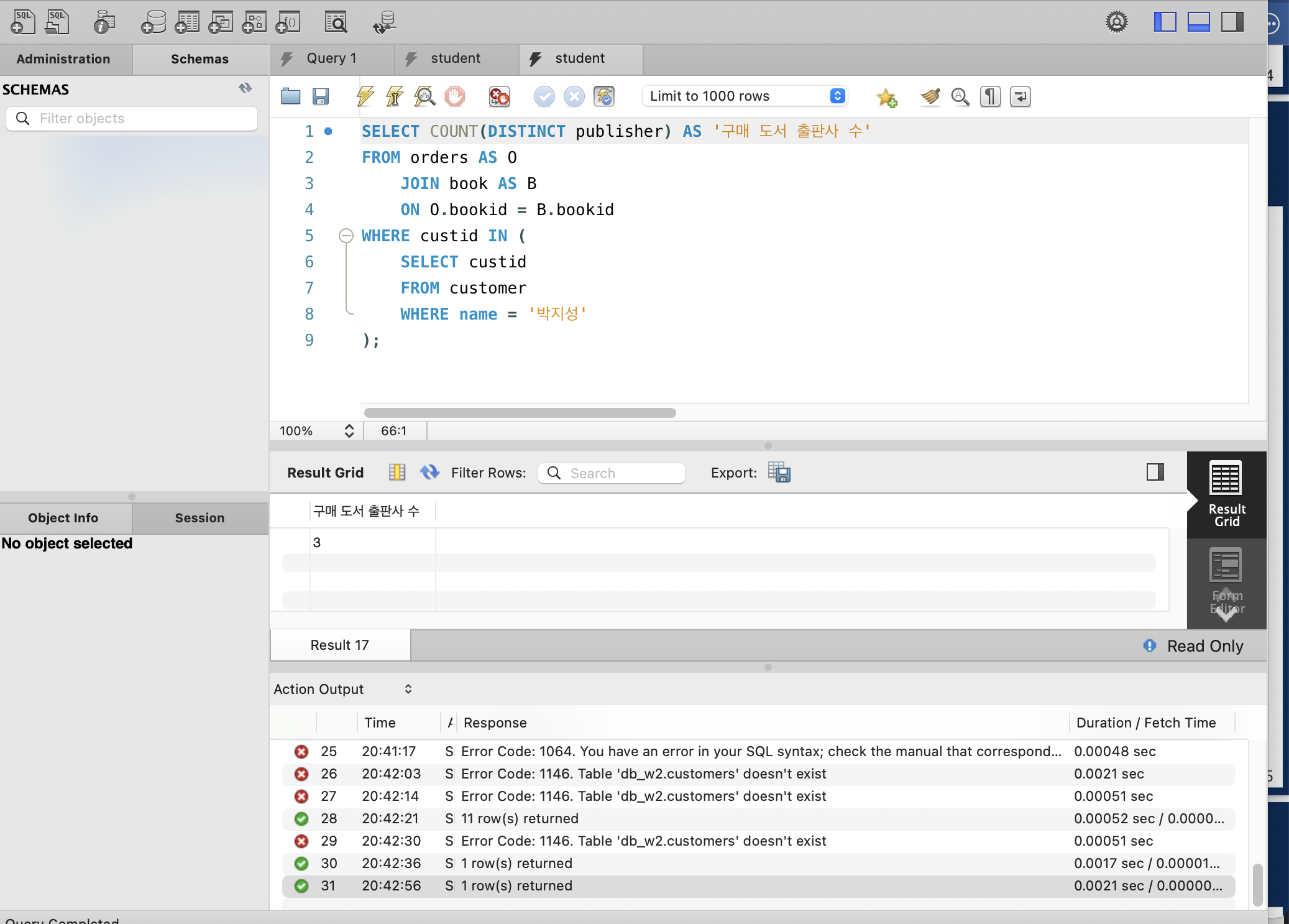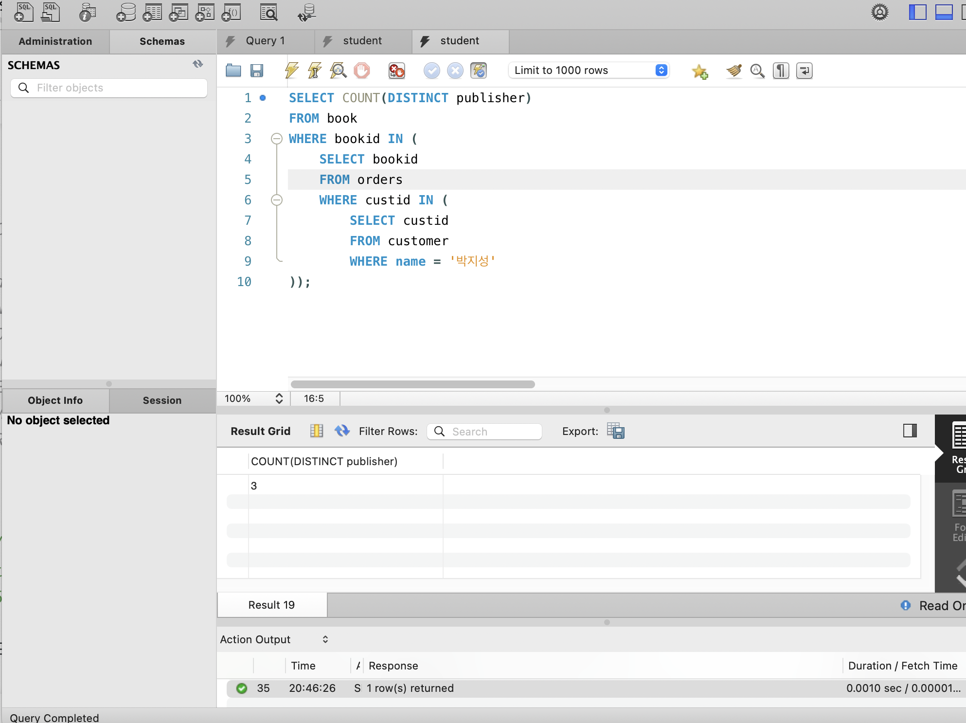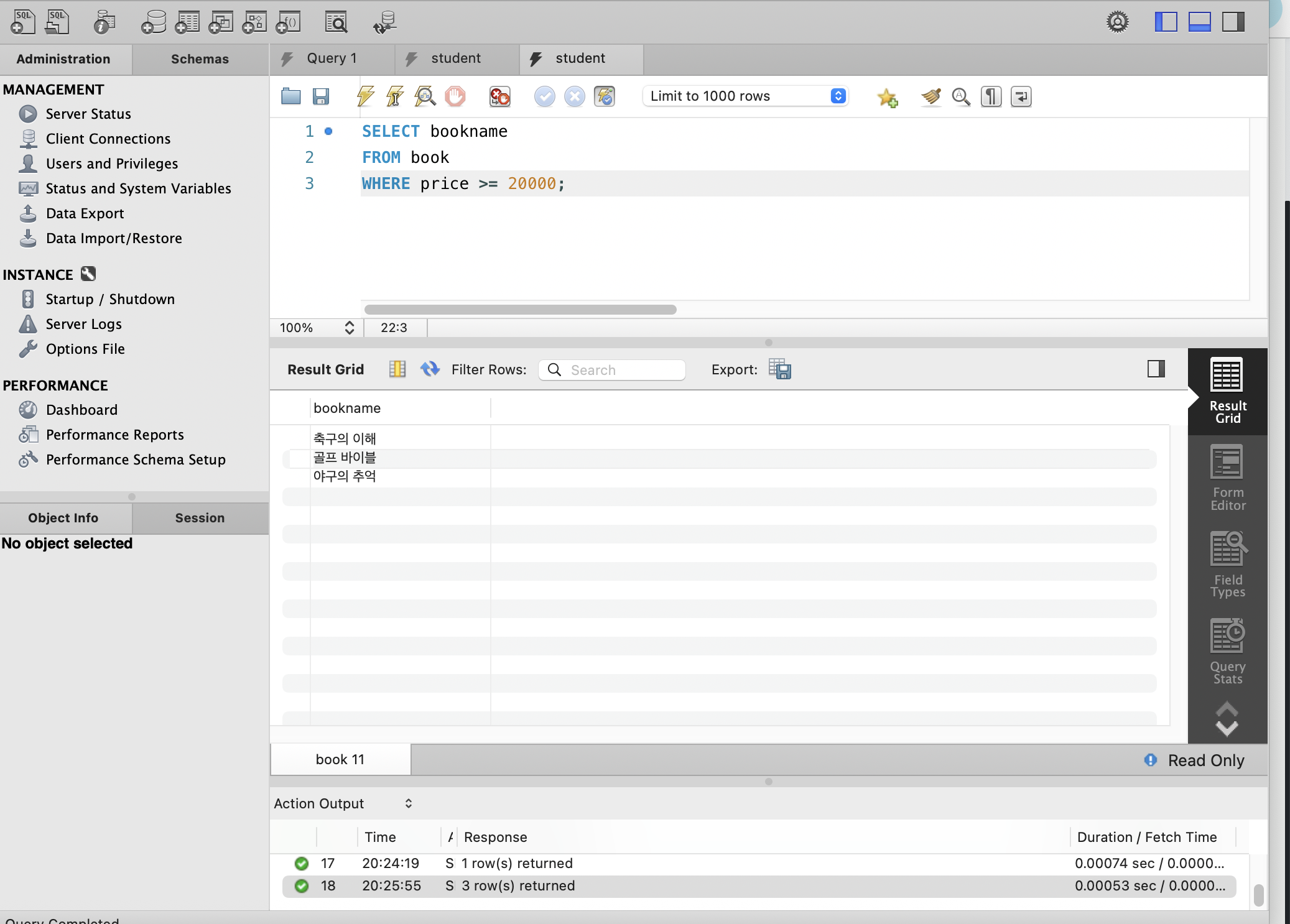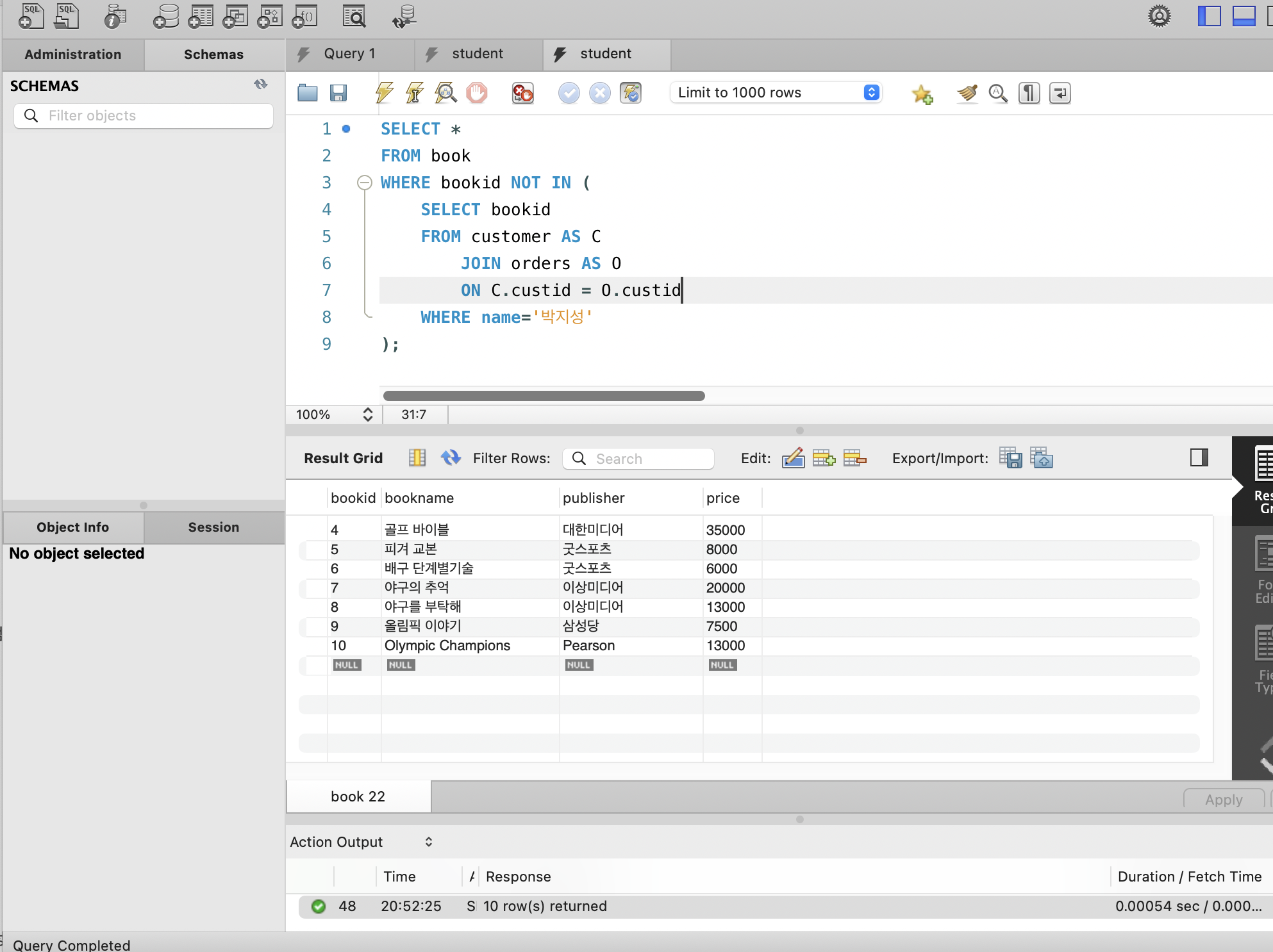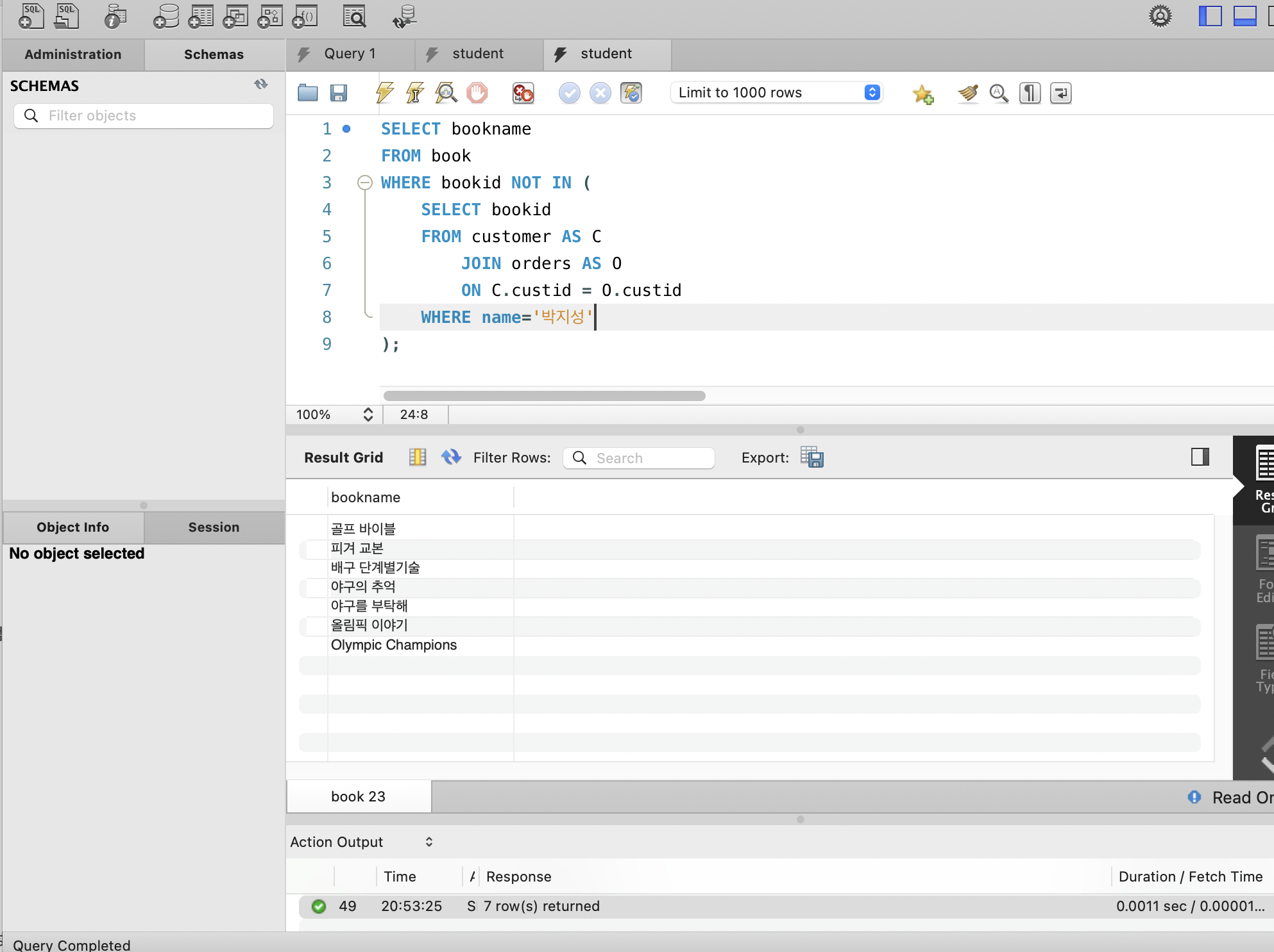 제대로 조회했는지 확인 위해서 일단 전체 조회를 위에처럼 해주고, SELECT에서 책 이름만 선택하도록 수정해 아래처럼 작성해주었다.