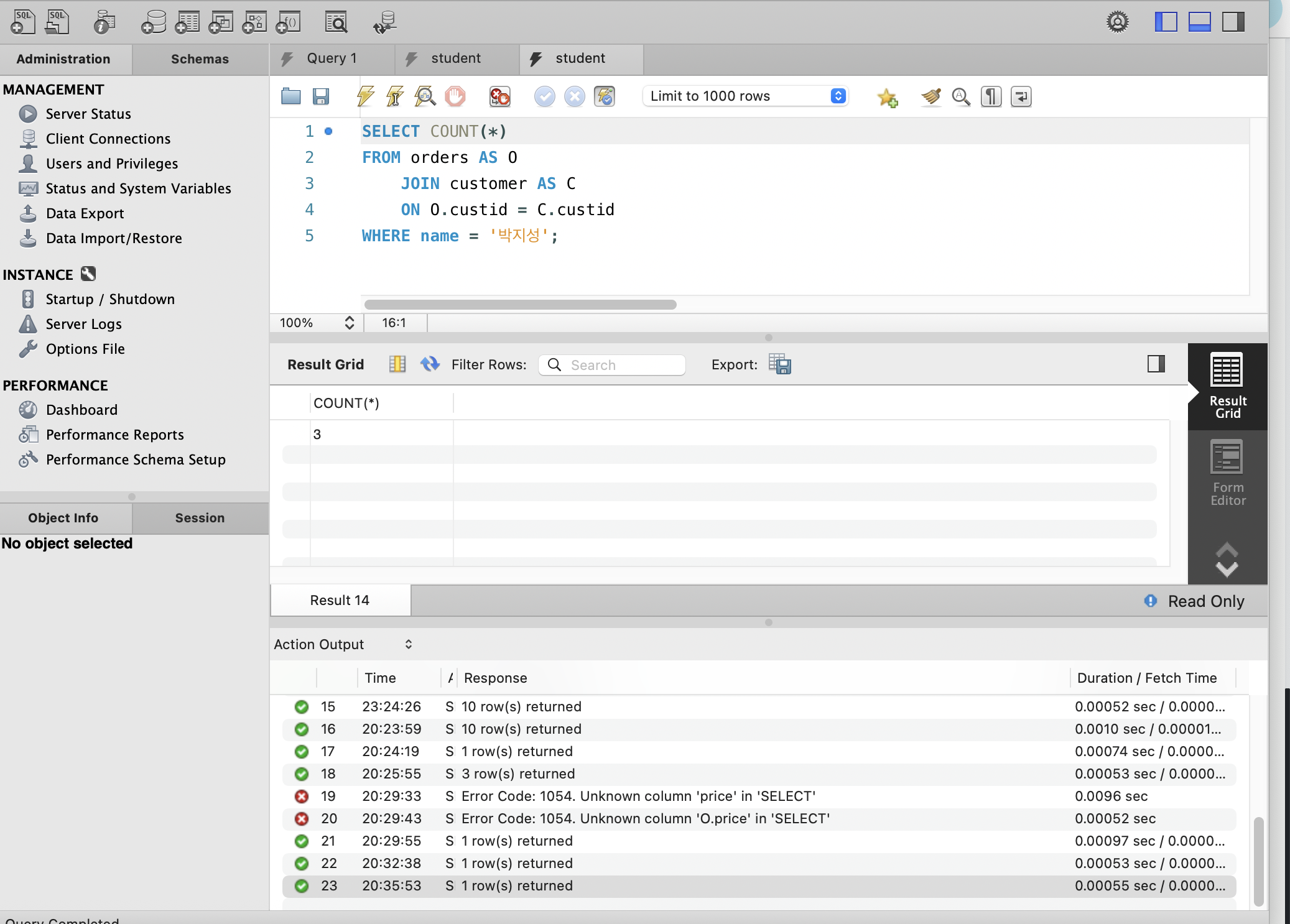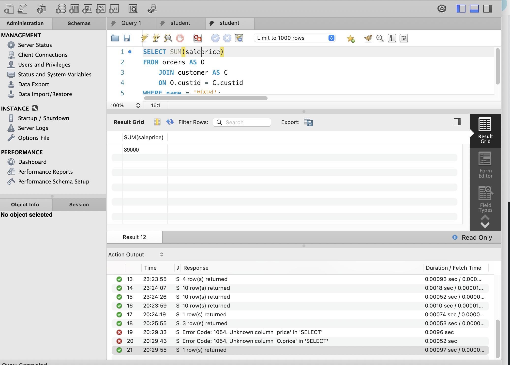 SELECT SUM(price)를 사용했는데 price라는 속성이 없다고 떠서 조인 사용하면`O.price`로 어떤 테이블의 속성인지 지정해줘야하나 싶어 수정.