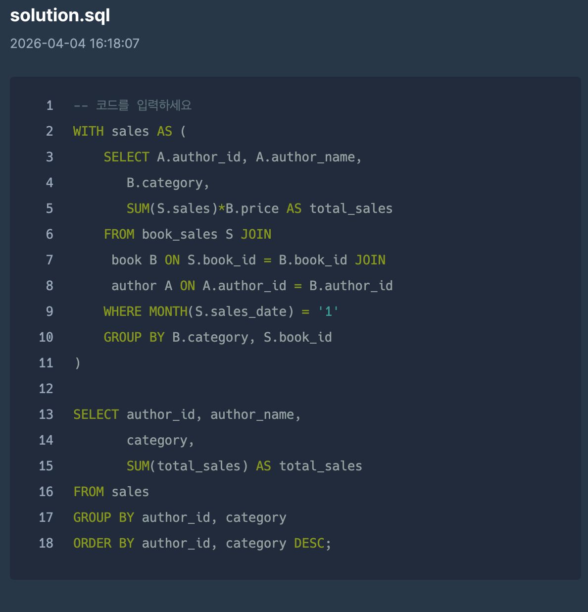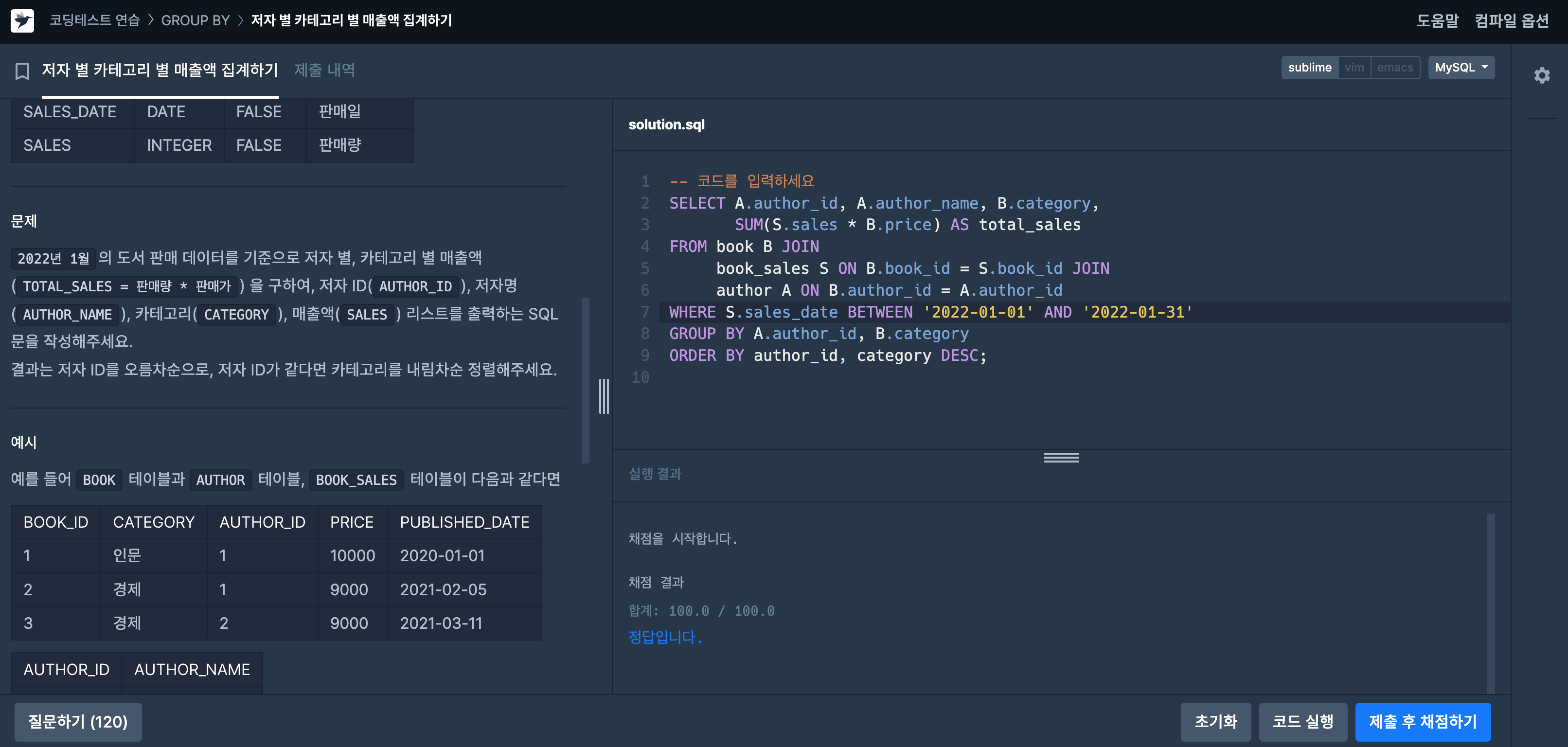 일단은 위에 문제를 풀 때는 카테고리별로 묶고, 그 안에서 책의 아이디 별로 묶어서 해당 책이 얼마나 팔렸는지를 먼저 기록하고, 그걸 토대로 다시 작가 아이디, 카테고리별로 묶었는데 이거를 사실 그냥 GROUP BY author_id, category, book_id로 하면 됐다.