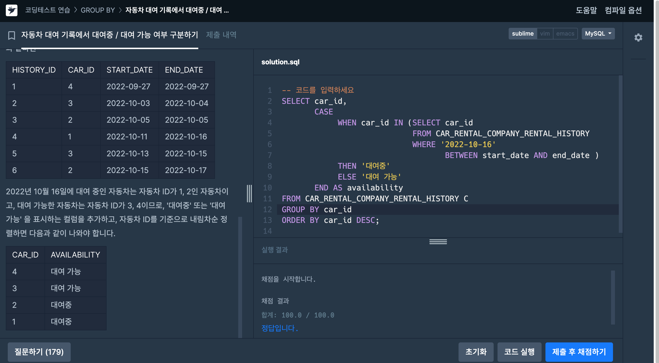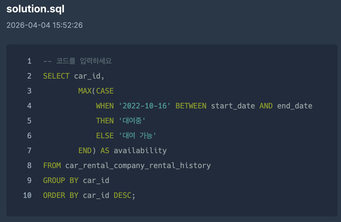 car_id를 기준으로 그룹화를 하고, SELECT절에서 CASE WHEN을 사용해 날짜 기준으로 조건의 날짜가 start_date나 end_date 사이에 있으면 대여중, 아니면 대여 가능을 반환하도록 했는데, 위의 문제는 해결하지 못했다.