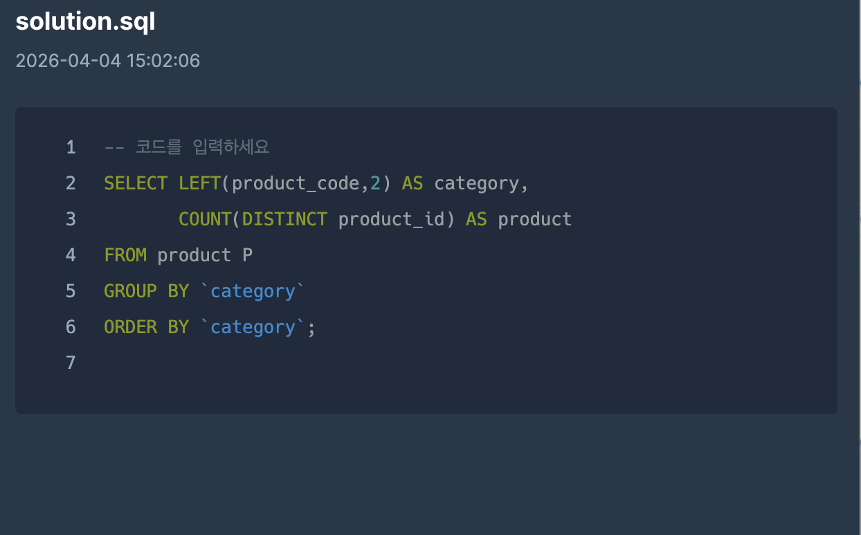 LEFT(속성,2) 이렇게 해서 우선 상품 코드의 앞 두 개를 카테고리로 SELECT에서 정의해주었다.