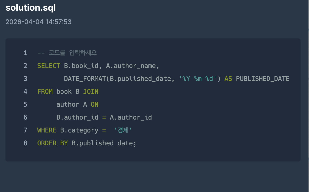 크게 복잡한건 없었고, 테이블 두 개를 JOIN으로 잘 연결한 후에 카테고리가 경제인 것들만 남기고, 날짜 형식만 요구대로 잘 조정해주었다.
