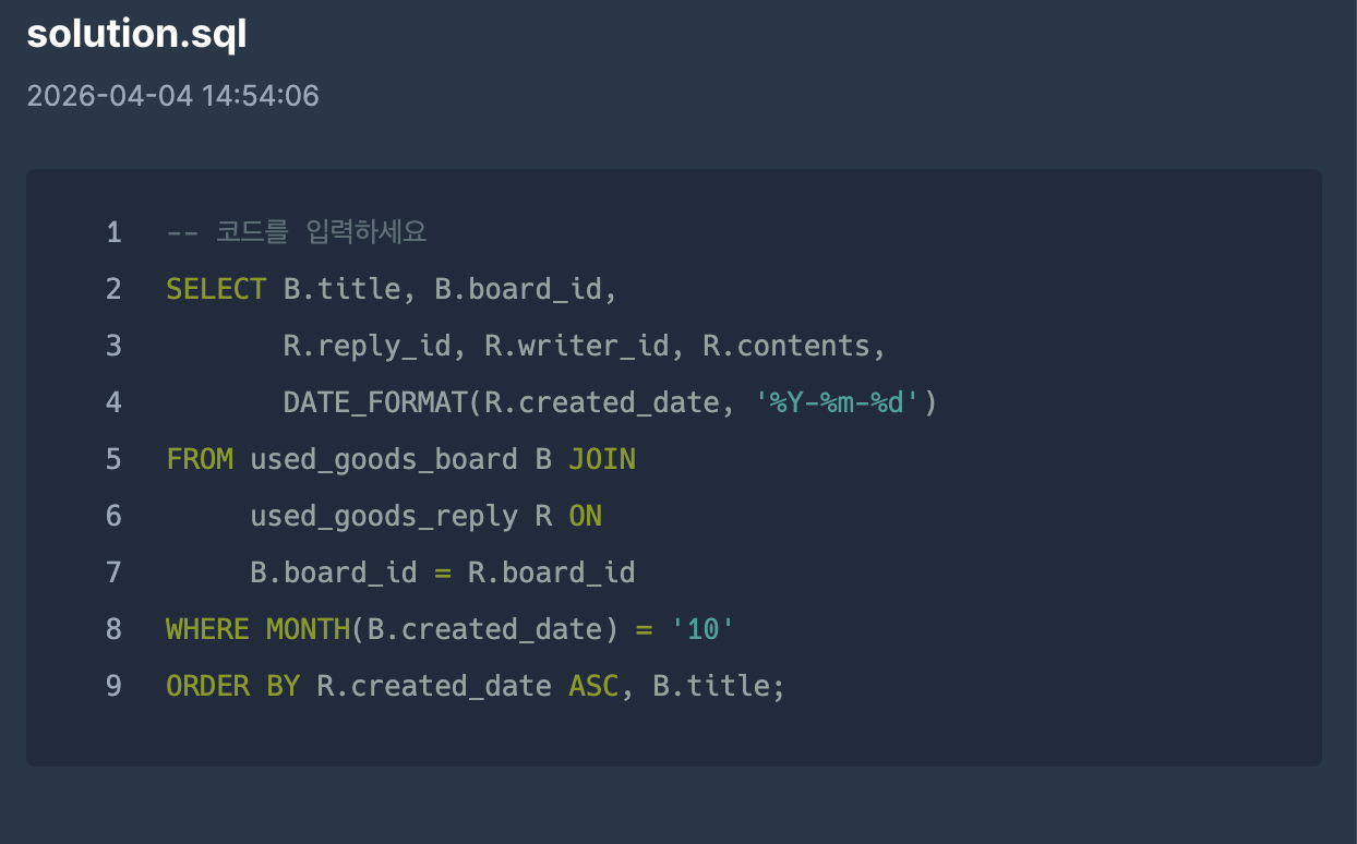 10월에 만들어진 게시글과 그 댓글 등의 정보를 조회해서 출력하는 문제여서 일단은 MONTH()를 써서 비교했는데...? 이게 연도 조건이 있었던걸로 기억하는데 이렇게 풀면 연도는 사실 상관없이 10월에 만든 글이면 다 출력될텐데...? 어떻게 통과가 된 것 같다.