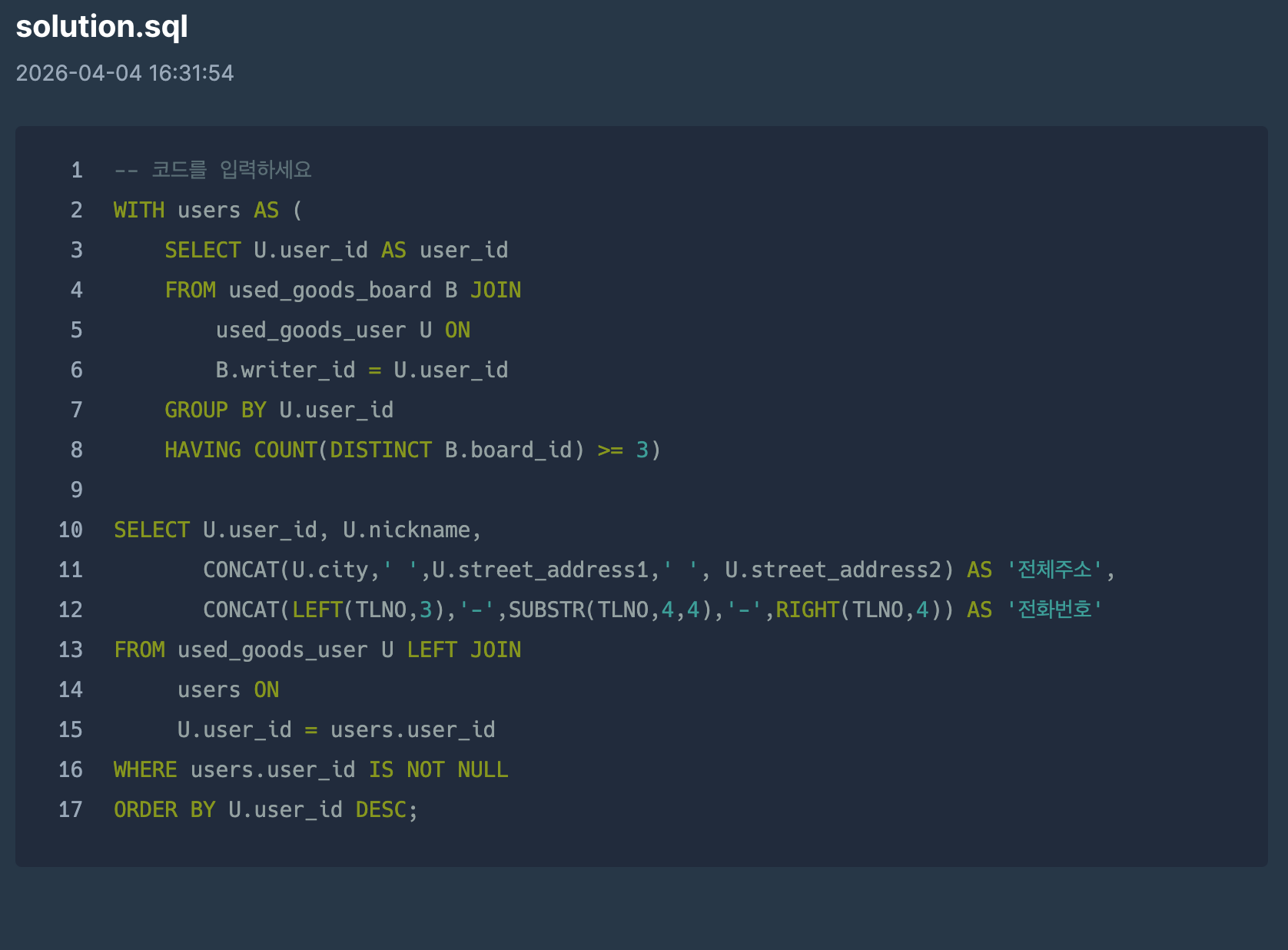 일단 위에서 3번 이상 게시글을 올린 사용자의 아이디만 테이블에 남겼다. 그룹화하고, HAVING 사용해서 이 부분은 풀었다.