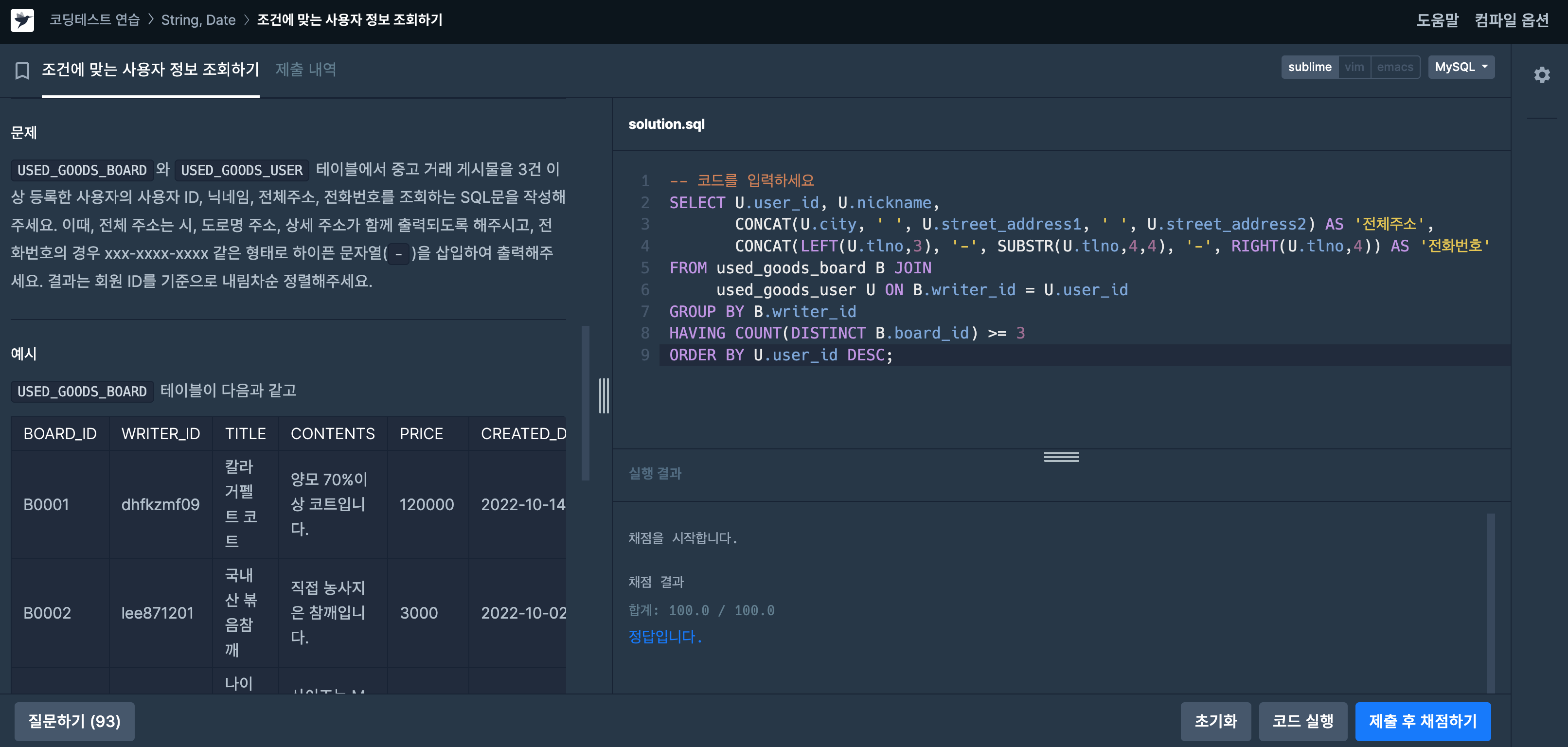 문제에서 신경써서 처리할 부분은 CONCAT() 써서 요구조건대로 문자열 만드는 부분이었다. 전화 번호 사이에 '-' 넣는 것이나 주소 연결하는 것만 잘 처리해주었다. (시키는대로 하면 되는데 그 조건이 은근 자잘해서 귀찮고 또 완전 안똑같으면 틀려서 몇 번 다시 풀었다.)