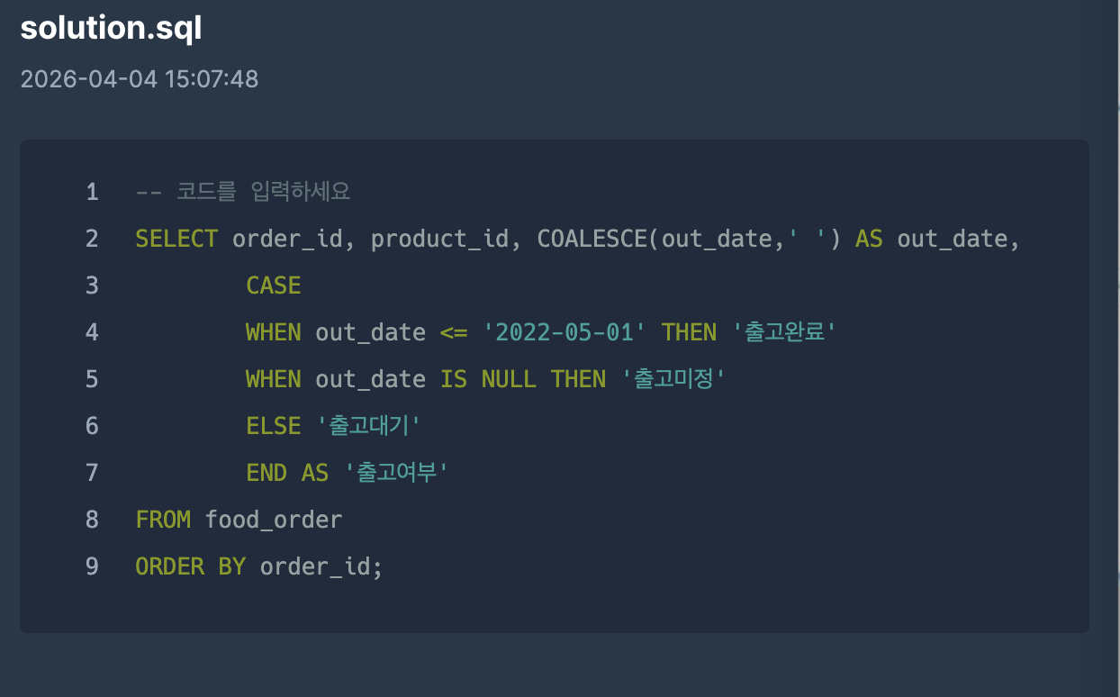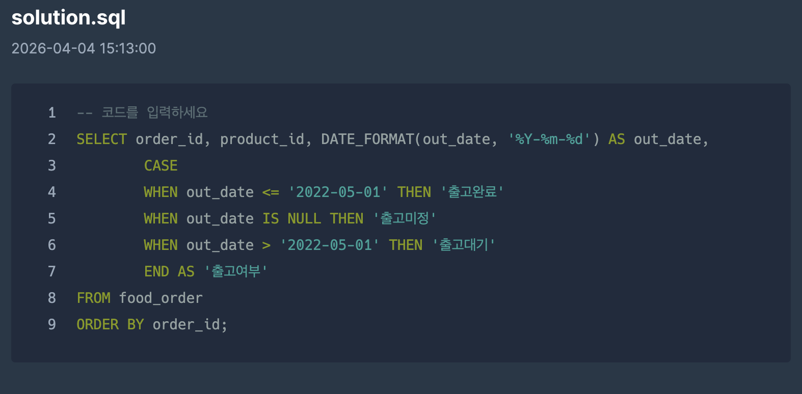 날짜 기준으로 출고 여부를 잘 출력해줘야하는 문제였는데, 일단 처음에 위에처럼 쿼리를 작성해서 여러번 틀렸다.