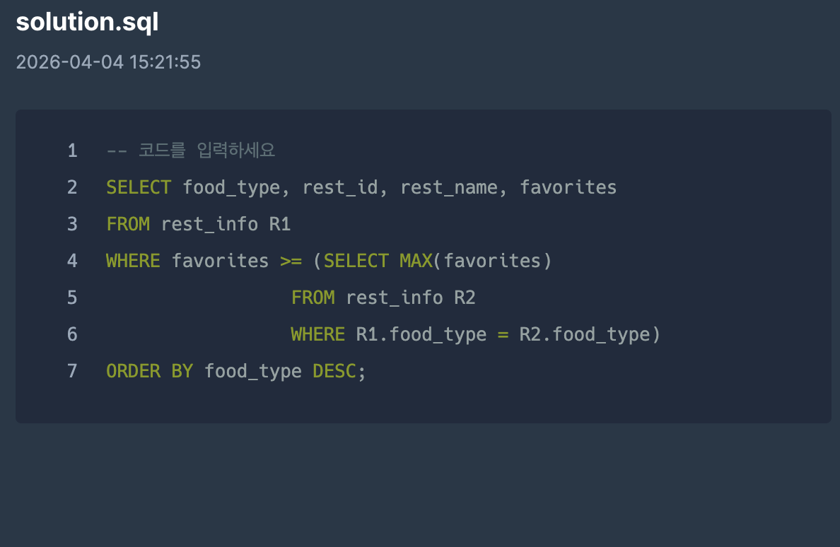 하위 쿼리에서 해당 음식 종류의 최대 즐겨찾기 수를 찾고 그것과 상위 쿼리의 즐겨찾기 수를 행마다 비교하며 각 음식 종류의 즐겨찾기 수가 가장 많은 음식점 정보를 잘 출력하면 됐다.