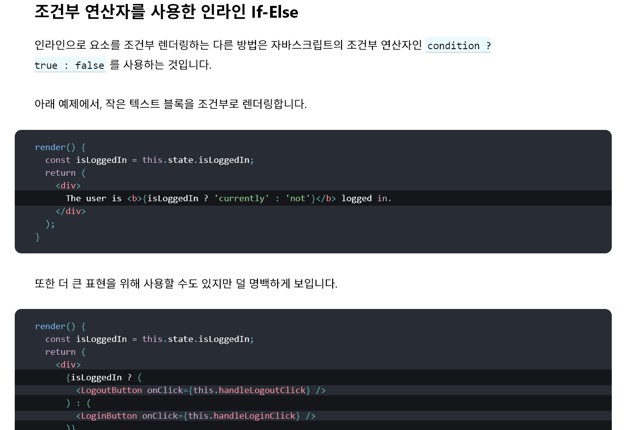 리액트 조건부랜더링 공식문서에서 정확하게 내가 쓴 코드를 덜 좋은 예시로 사용하는 걸 발견했다 두둥💥