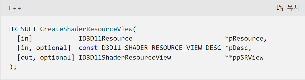 vertices buffer, indices buffer, constant buffer, etc..를 제외한 나머지 자원은 resource view를 통해서 자원을 렌더링 파이프라인에 연결해야 한다.