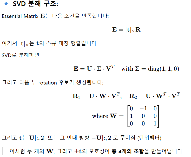 이는 거리 값(t)를 cross product의 Matrix 형태에 Rotation Matrix를 곱한 형태와 같다. 역으로 Essential Matrix를 SVD 분해하면 Rotation과 t를 구할 수 있다.