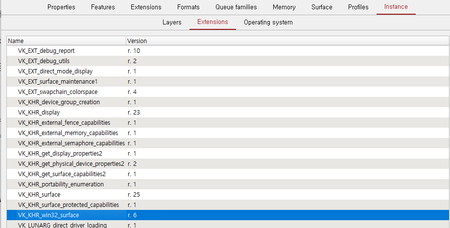 - 접미사로 instance extension이 들어간다. ex> KHR : 크로노스 그룹, EXT : Multi-vendor(여러 회사 협약), NV : NVidia, AMD, INTEL