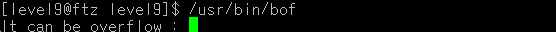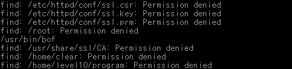 level10 유저의 SetUID 권한을 가진 파일을 검색하면 /usr/bin/bof 파일을 찾을 수 있다.