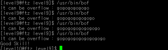 if문을 보면 buf2와 "go"를 비교하여 그 값이 일치할 경우 level10의 권한을 얻고 쉘이 실행된다. 따라서, level10 권한을 얻으려면 버퍼 오버플로우를 이용해 buf2 배열에 "go"를 집어넣어야 한다.