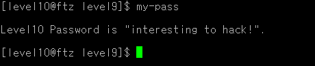"go"를 9번 반복 입력하니 if문이 실행되어 level10의 권한을 얻었다. buf 배열과 buf2 배열의 시작 주소가 16byte 차이임을 유추할 수 있다.