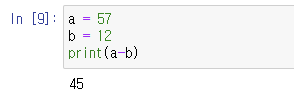 마찬가지로 a에 57을 저장하고, b에 12를 저장한 뒤에 print( )함수로 a-b의 값을 출력했습니다. 값을 출력하는 것보다 a-b를 계산하는 우선순위가 더 높아서 print(a-b)도 가능했습니다.