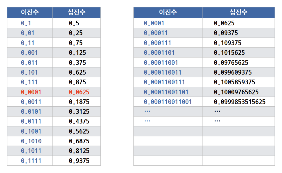 간단히 설명하면 컴퓨터는 0과 1, 이진수(binary, binary number)를 사용한다는 걸 들어보신 적 있으실 겁니다. 우리 인간은 십진수(decimal, decimal number)를 사용하죠. 정수 부분만큼은 이진수로 십진수를 모두 표현 가능하지만, 문제는 소수 부분을 완전히 표현하는 게 불가능하다는 것이었습니다.