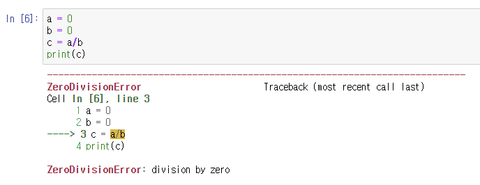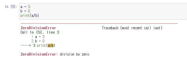 에러가 발생합니다. 0으로 나눌 때 발생하는 에러를 ZeroDivisionError라고 합니다.
