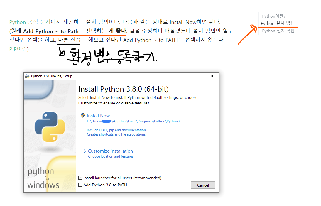 만약 체크하지 않았다면 cmd에서 Python 명령어는 실행되지 않았을 것이다. 또 번거롭게 추가해야 된다... 추가하는 방법은 1-1. Add Python ~ to Path에 나와 있다.