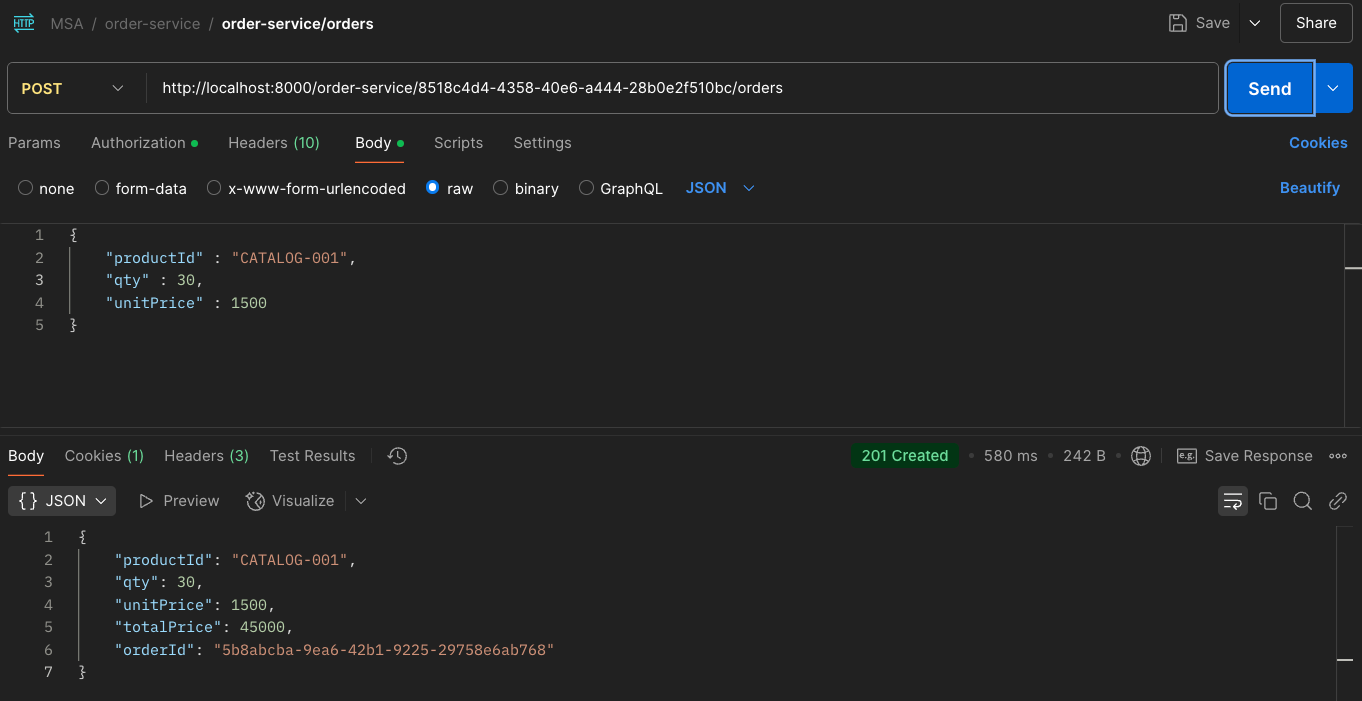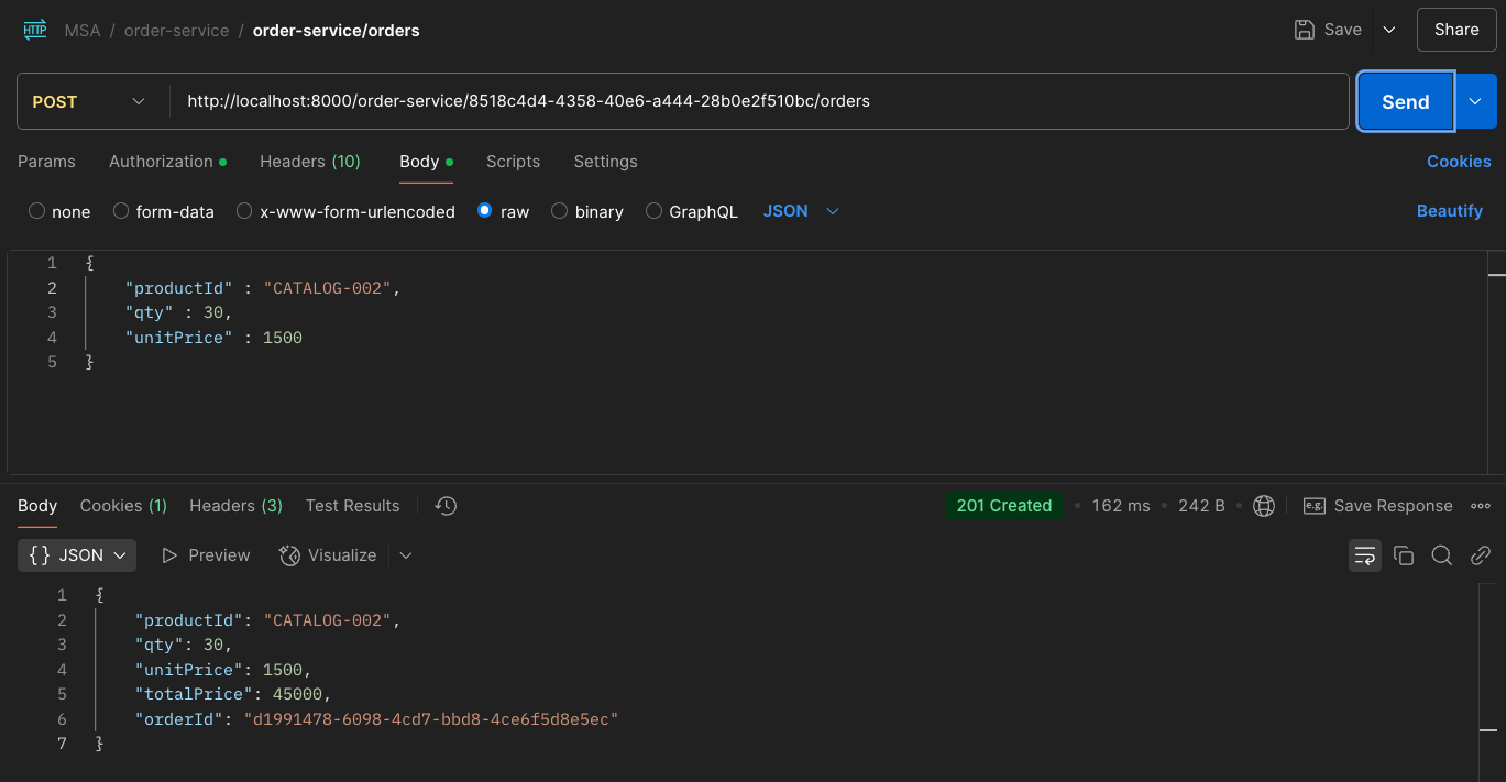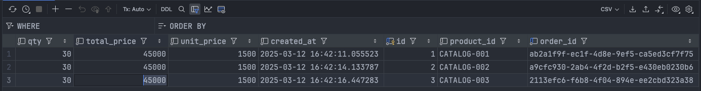 위 사진은 order-service에 catalog-001, 002, 003 주문을 3번 넣는 과정이다.