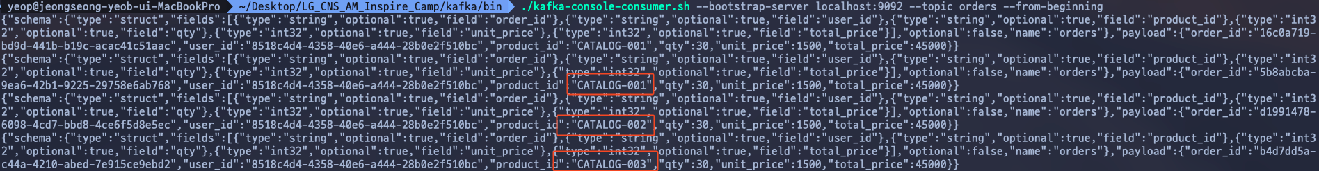 사진이 잘 보일지 모르겠지만, 각각 요청한 catalog-001, 002, 003이 orders 토픽에 제대로 저장된 모습을 볼 수 있다.