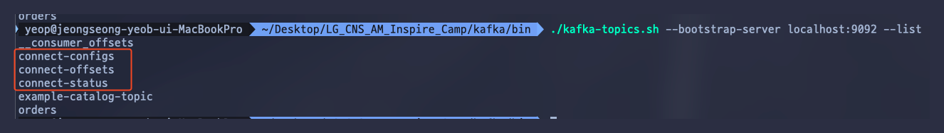 이후, 토픽 리스트를 확인해보면 connect 관련 토픽이 3개 생긴 모습을 볼 수 있다.