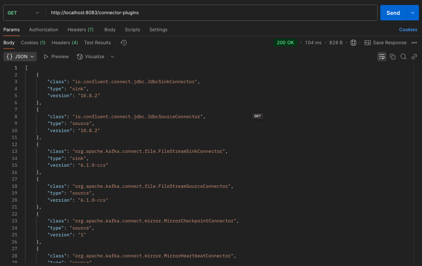 위 사진과 같이 8083포트의 /connector-plugins 엔드포인트로 get 요청을 날리면 현재 등록된 커넥터들을 확인할 수 있다.