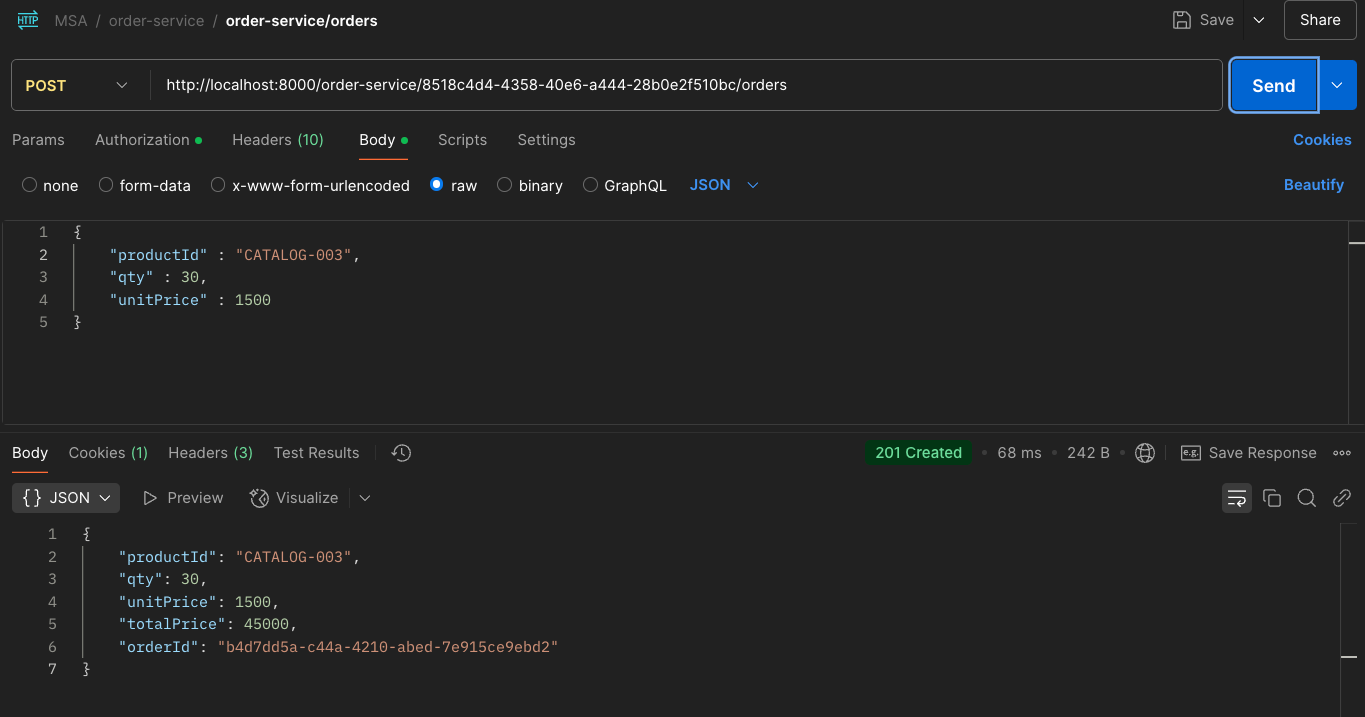 @PostMapping("/{userId}/orders") public ResponseEntity<ResponseOrder> createOrder(@PathVariable("userId") String userId, @RequestBody RequestOrder orderDetails) { log.info("Before add orders data"); ModelMapper mapper = new ModelMapper(); mapper.getConfiguration().setMatchingStrategy(MatchingStrategies.STRICT); OrderDto orderDto = mapper.map(orderDetails, OrderDto.class); orderDto.setUserId(userId); orderDto.setOrderId(UUID.randomUUID().toString()); orderDto.setTotalPrice(orderDetails.getQty() * orderDetails.getUnitPrice()); ResponseOrder responseOrder = mapper.map(orderDto, ResponseOrder.class); /* send this order to the kafka */ kafkaProducer.send("example-catalog-topic", orderDto); orderProducer.send("orders", orderDto); log.info("After added orders data"); return ResponseEntity.status(HttpStatus.CREATED).body(responseOrder); }
