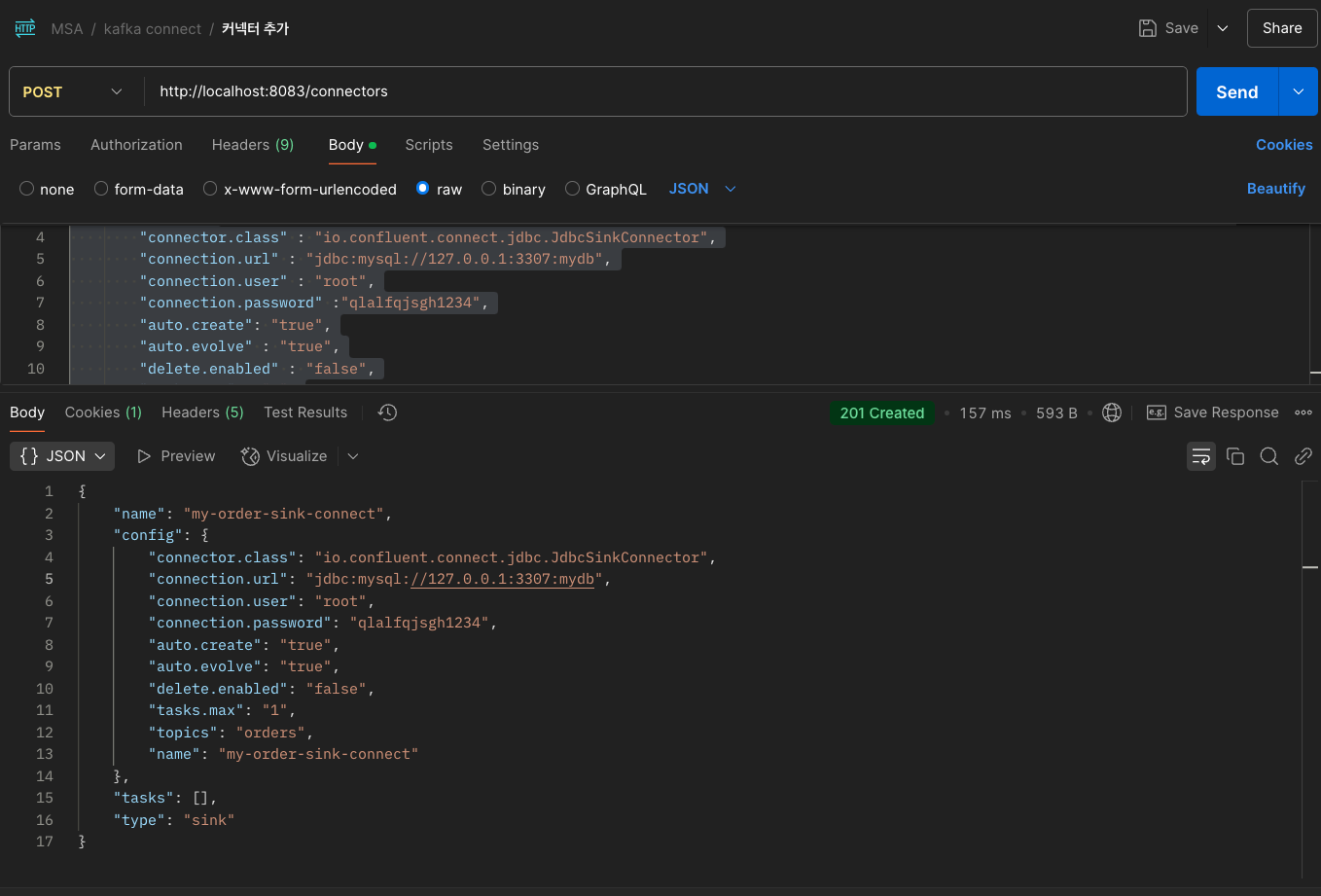 { "name" : "my-order-sink-connect", "config" : { "connector.class" : "io.confluent.connect.jdbc.JdbcSinkConnector", "connection.url" : "jdbc:mysql://127.0.0.1:3307:mydb", "connection.user" : "root", "connection.password" :"개인 DB 비밀번호", "auto.create": "true", "auto.evolve" : "true", "delete.enabled" : "false", "tasks.max" : "1", "topics" : "orders" } }