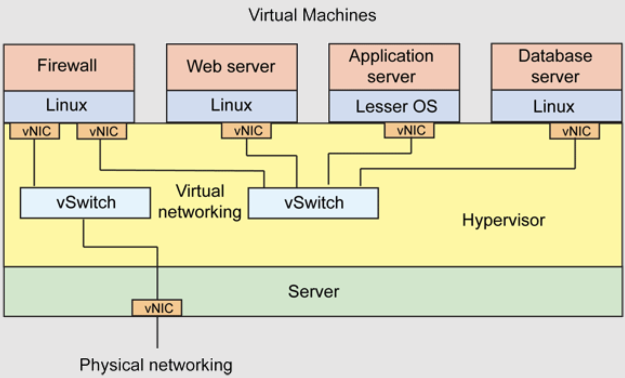 하이퍼바이저는 물리적 NIC와 같은 역할을 하는 vNIC(가상 NIC)를 각 VM에 하나 이상 생성하여 가상 네트워크의 동적 구현을 허용하도록 하고, VM간 통신이 가능하도록 한다.