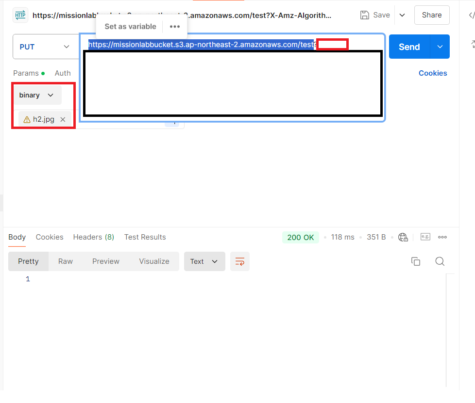 다음으로, 클라이언트는 서버로부터 응답받은 url에 binary타입으로 이미지를 첨부해 put 요청을 날린다.