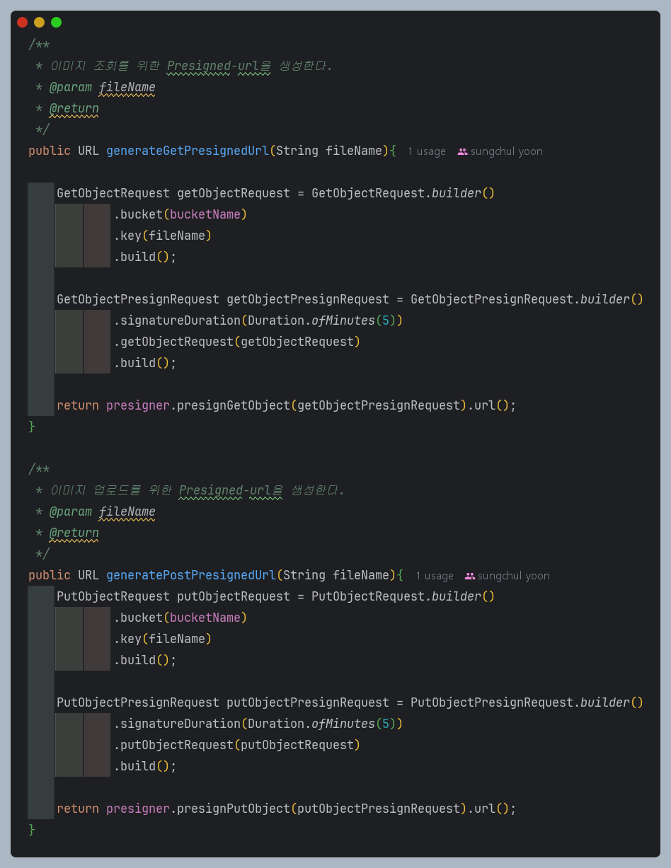 이미지 업로드, 조회를 위한 get과 put 방식의 presignedurl을 생성하는 메서드를 작성한다.