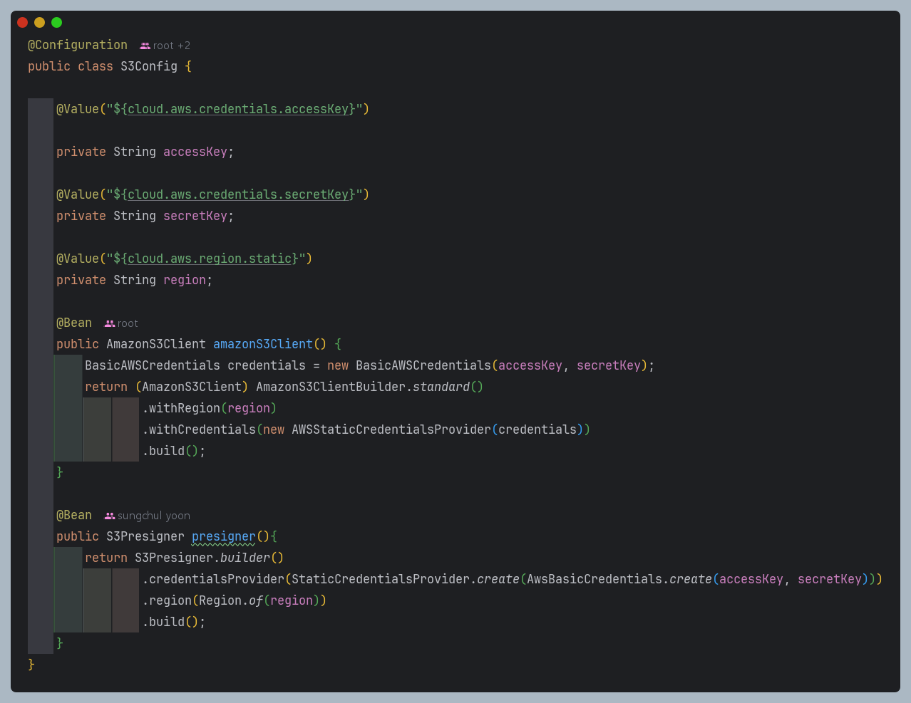 config파일에서 명시한 presigner bean 의존성을 추가한다.