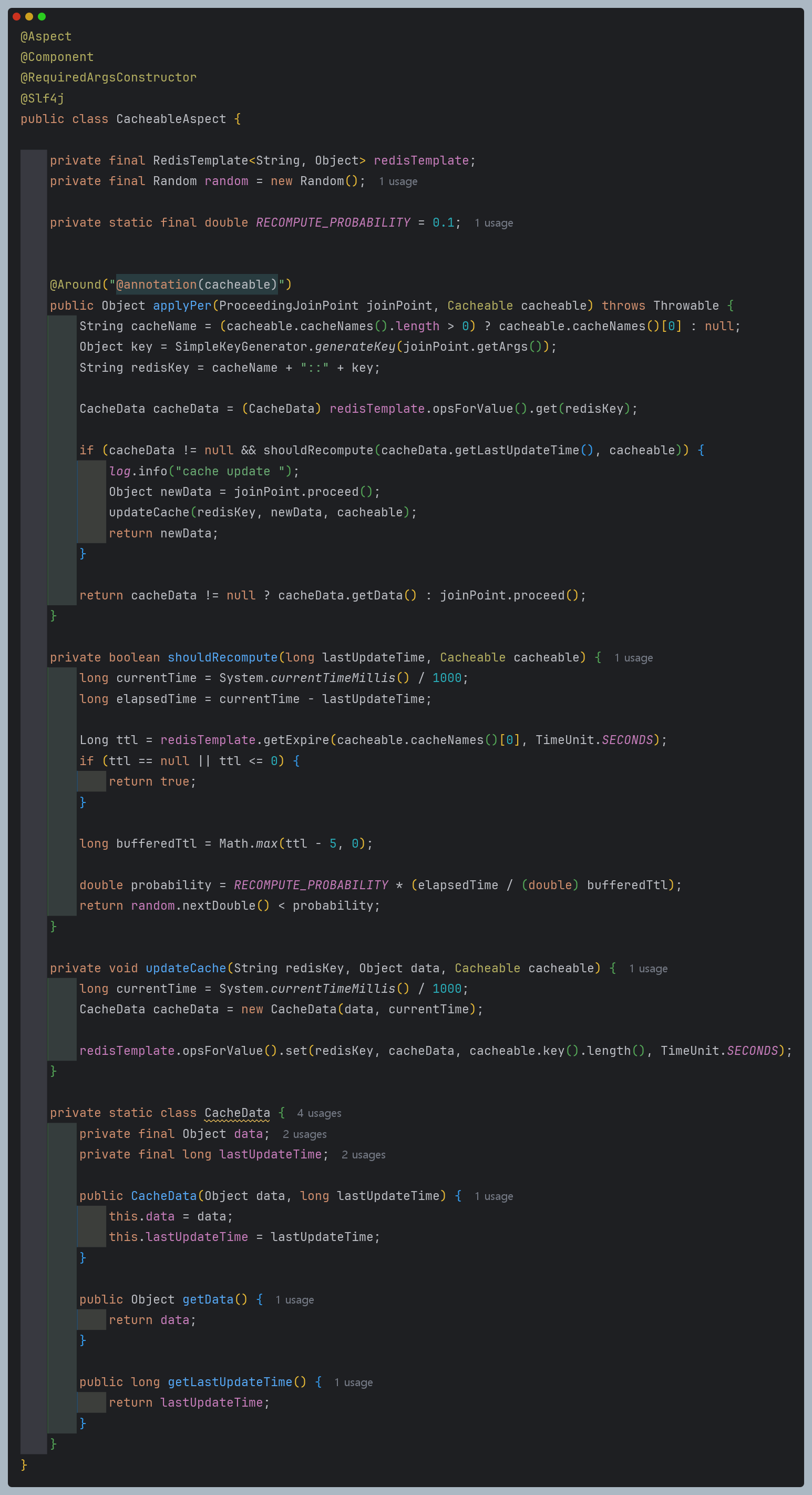 정리하자면, TTL이 남아 있지만, 5초 이하로 줄어들면 데이터 갱신을 시도해 캐시 히트율을 높히는 코드라고 할 수 있겠다.