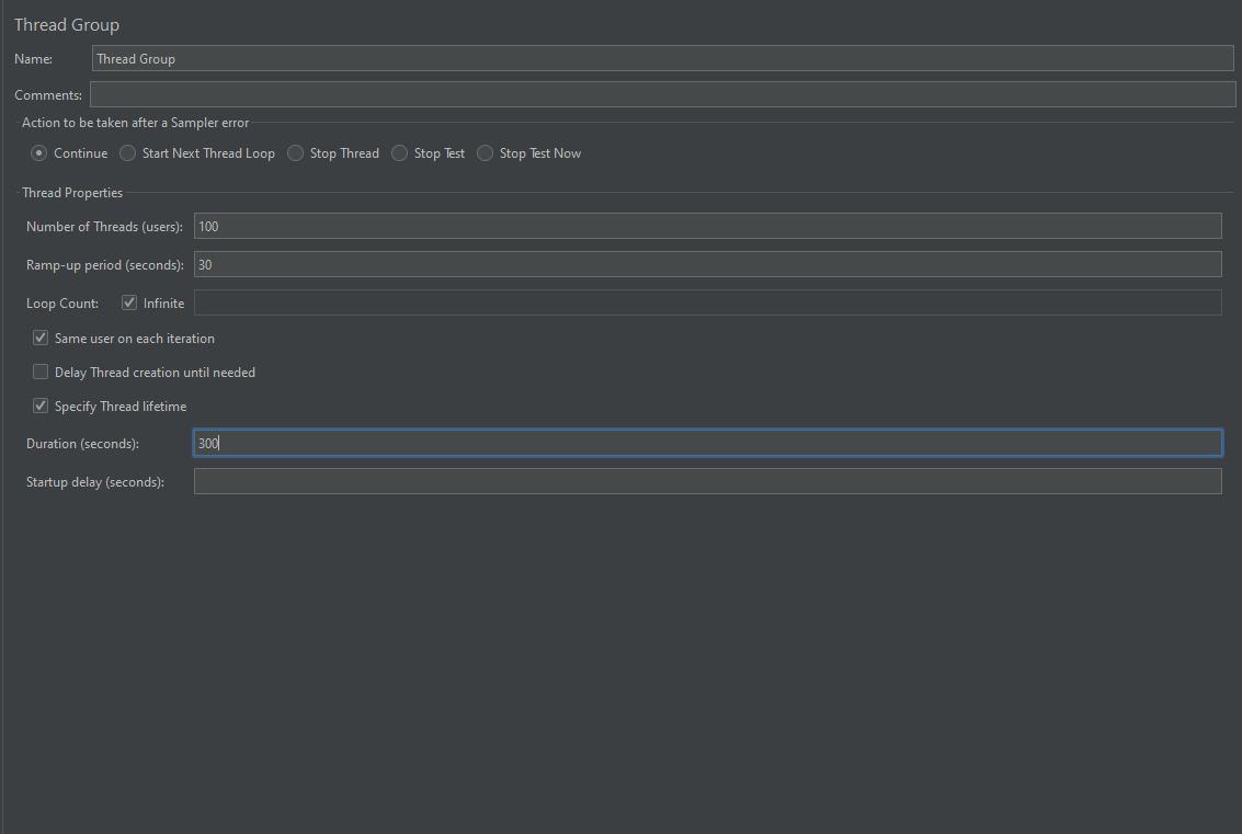 100개의 쓰레드, 30초당 요청, 5분동안 지속하도록 Thread Group을 설정했다.