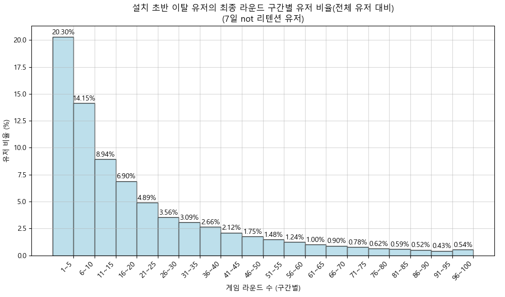 그렇다면 설치 초반에 이탈하는 약 80%의 유저들은 어느정도 게임 후 이탈할까? 정말 이 유저들은 gate때문에 이탈하는 것일까? 아니면 다른 이유가 있을까?