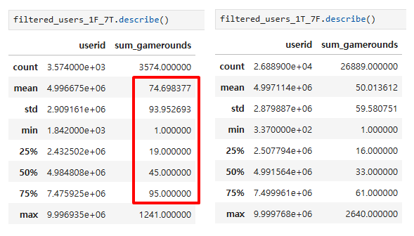 retention_1은 gate_40일때가 약 3% 높다.retention_7은 gate_40일때가 약 4% 높다.통계적/시각적 검정 결과를 바탕으로 결론 짓자면, 'gate를 40으로 변경한다.'는 결론이 나올 수 있다. 하지만, 게임 내에서 gate는 단순히 유저의 게임 진행을 방해하는 목적으로 존재하는 것이 아니다. 회사의 수익과 직결되는 부분이기도 하다. 따라서 조금 더 세부적인 분석이 필요하다고 판단했다.