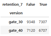 sum_gamerounds 임계값 이하 user_id Dropgate_30, gate_40 유저들 중 해당 라운드까지 플레이하지 않은 경우gata_30인 유저는 30라운드에 게이트(허들)을 만나는데, 그 전에 플레이를 종료1-2 사례와 동일한 이유로 Dropgata_30 유저 중 sum_gamerounds가 30 미만인 16,655건 Drop.gata_40 유저 중 sum_gamerounds가 40 미만인 13,827건 Drop.카이제곱검정을 통해 version(gate_30, gate_40)과 retention_1, retention_7의 독립성 유무 판단.