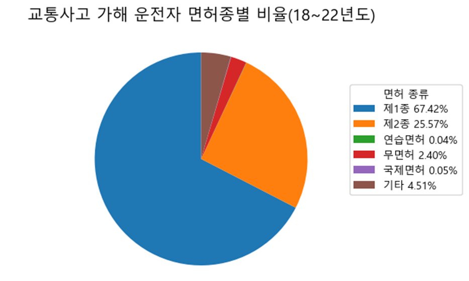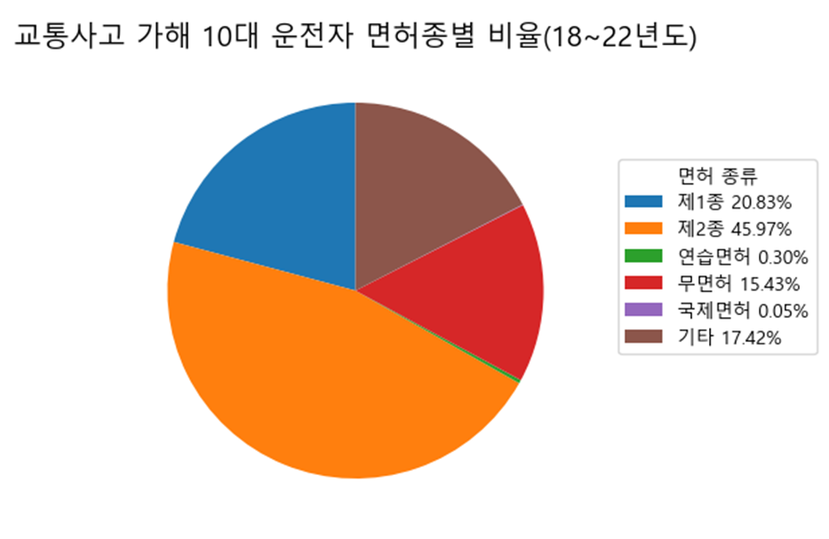 위 그림과 같이 10대 운전자는 무면허사고 비중이 높다. 또한 10대 운전자의 모수가 적기 때문에, 운전에 대한 자격없이 적은 인원이 운전을 하면서 사고를 일으키는 경우가 많다.