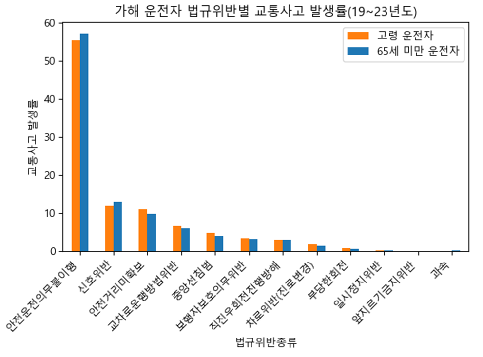해당 그래프를 통해 흥미로운 발견이 있었다. 예상대로 고령 운전자는 '안전운전의무 불이행'이라는 항목으로 가장 많은 교통사고를 일으켰다.