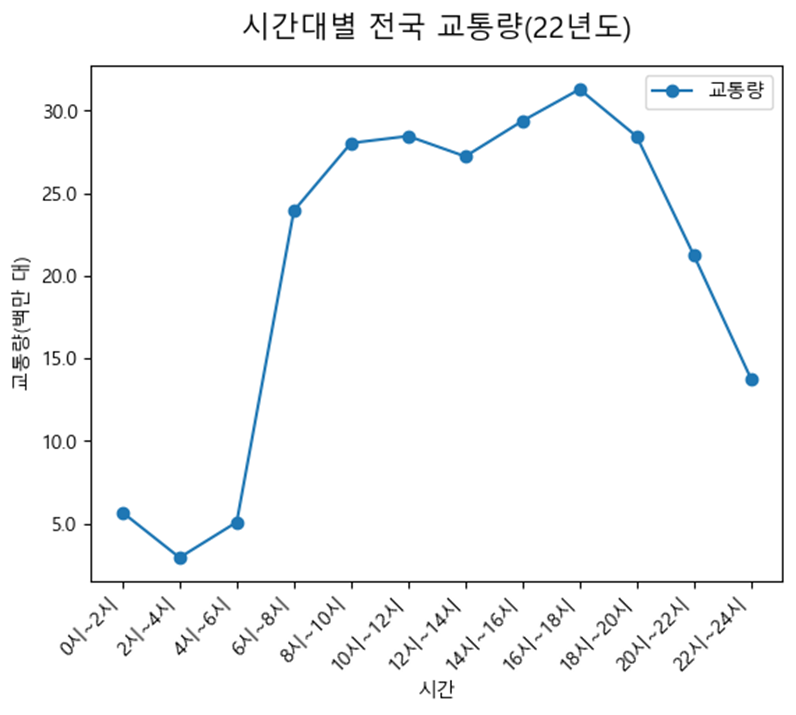 오히려 고령 운전자의 교통사고는 전국의 시간대별 교통량 추이와 비슷하다는 것을 알 수 있다.