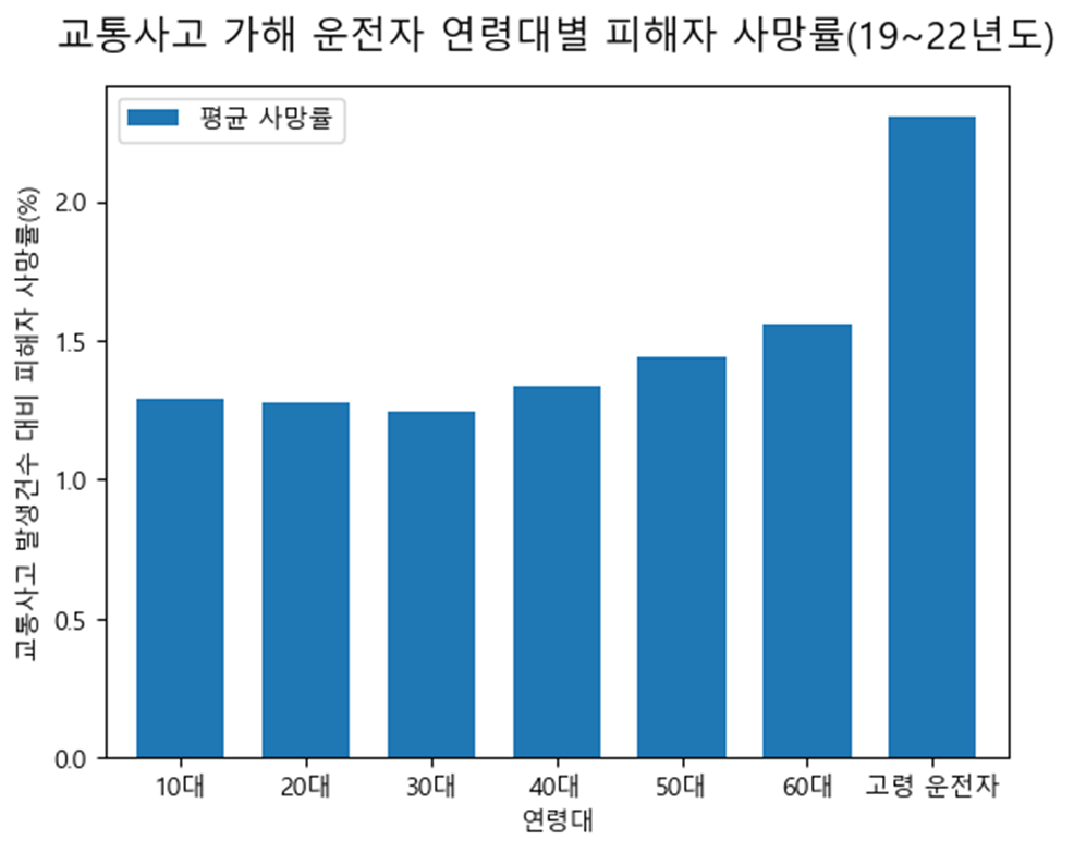 다시 본론으로 돌아오자. 그렇다면 고령 운전자의 교통사고는 얼마나 위험할까? 다른 연령대의 운전자와 비교해보자. '교통사고를 일으킨 운전자 연령대'를 기준으로 했을 때, '해당 교통사고에서 피해자의 사망률'을 기준으로 사망률을 계산했다. 그래프와 같이 65세 이상 고령 운전자의 피해자 사망률은 다른 연령대의 비해 약 1.5배 이상 높은 것을 알 수 있다. (10대 운전자 대비 약 56.06% 높다.)