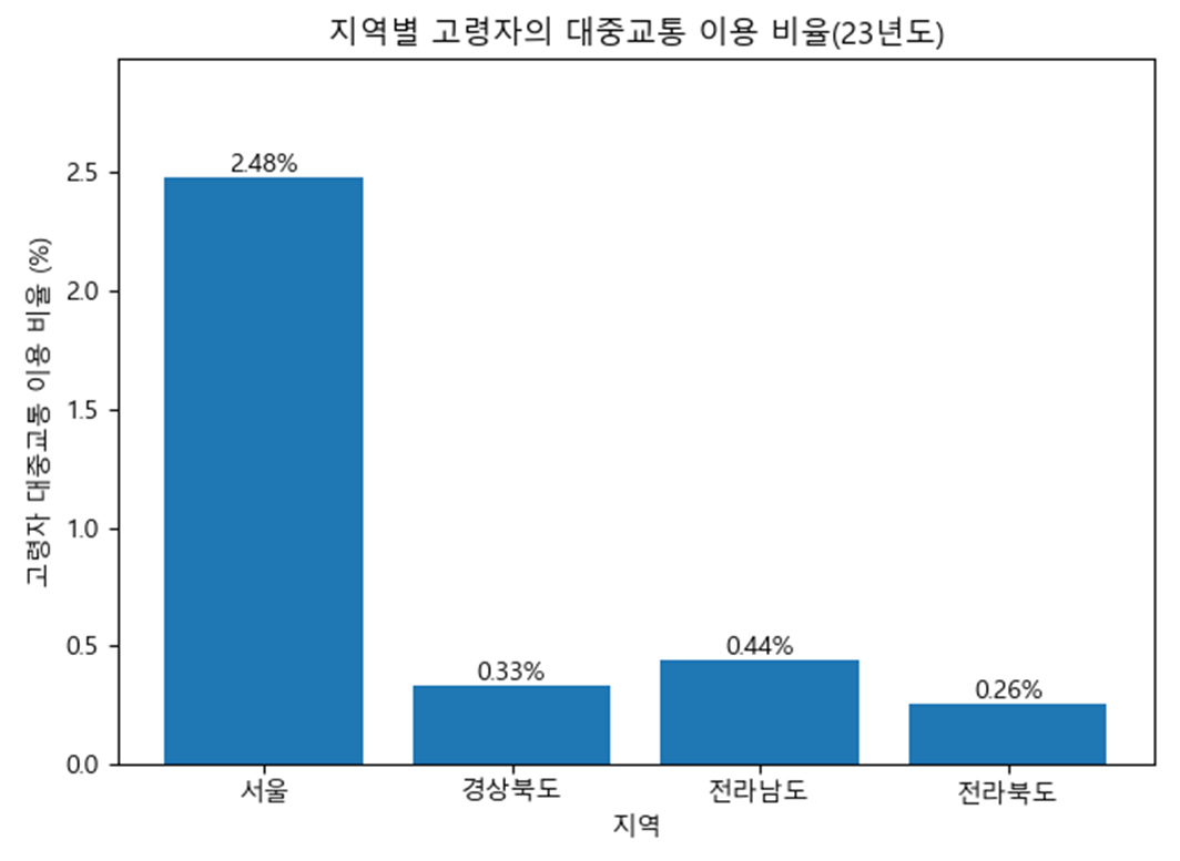 특히, 해당 지역은 타시도에 비해 고령자의 대중교통 이용 비율 또한 낮다는 것을 확인했다. 17개의 시도에서 경북, 전남, 전북은 각각 13위, 12위, 16위 차지했다.
